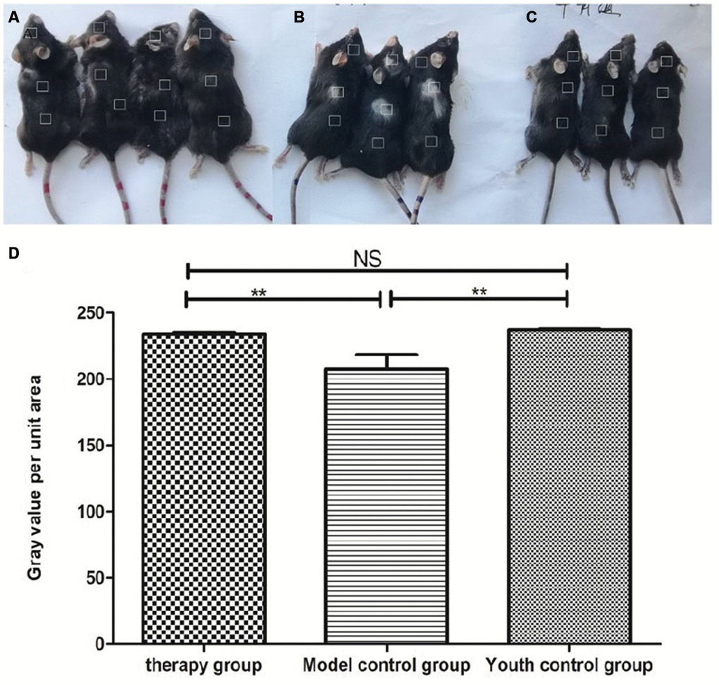 Gross view with the naked eye: The model control group showed white hair and partial hair loss on the back (Figure 7B). The hair on the back of the treatment group regrew, and the hair turned black (Figure 7A). The grayscale values were measured and statistically analyzed with PS software; the grayscale values of the hair of the treatment group were higher than those of the model control group (p<0.01) (Figure 7D, Table 2).