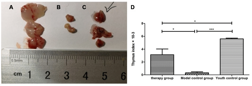 Gross view with the naked eye: The thymus in the young control group was yellowish in color, soft in texture and normal in size. The thymus color in the treatment group and the model control group was darker, and the volume was reduced. The volume of the treatment group was significantly larger than that of the model control group (Figure 8). According to statistical analysis, the mean values of the thymus index in the young group, the treatment group, and the model control group were 5.60 ± 0.21, 3.10 ± 1.54, and 0.47 ± 0.21, respectively (Table 3).