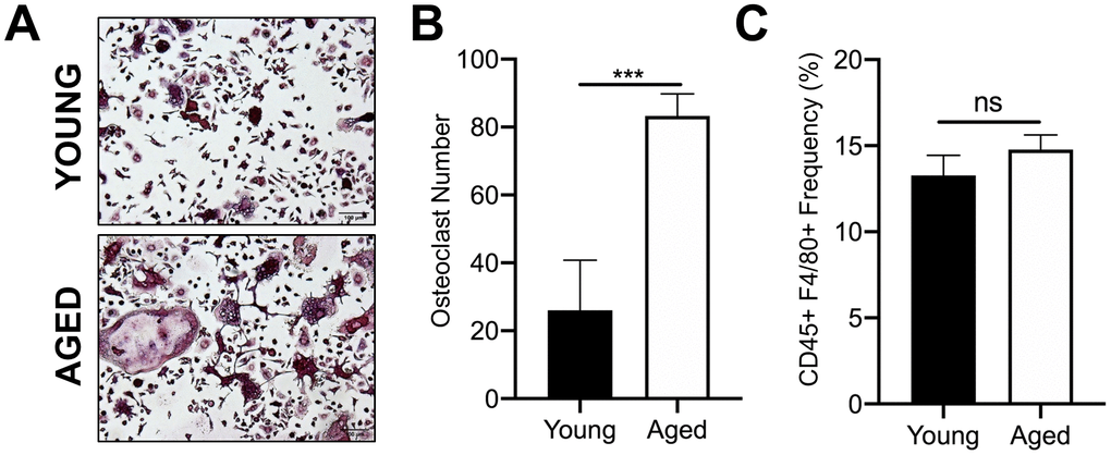 We first confirmed that OC progenitors from aged C57BL/6J mice have increased potential to undergo osteoclastogenesis compared to those from young mice. For these studies, we used CD45+F4/80+ macrophages isolated by fluorescence activated cell sorting (FACS) of bone marrow from aged (22-25 months) and young (3-4 months) mice. We previously reported that this subpopulation are also CD11b+, which is a classical osteoclast marker [23]. In vitro osteoclastogenesis was performed by culturing these cells with the necessary OC cytokines, RANKL (80 ng/ml) and M-CSF (20 ng/ml). Similar to previous reports [24], the number of TRAP+ multinucleated osteoclasts generated from aged CD45+F4/80+ macrophages was 3.2-fold higher than that generated from young CD45+F4/80+ macrophages (***p<0.001) (Figure 1A, 1B). However, aging did not appear to affect the frequency of the CD45+F4/80+ macrophage subpopulation in the bone marrow of young versus aged mice (Figure 1C).