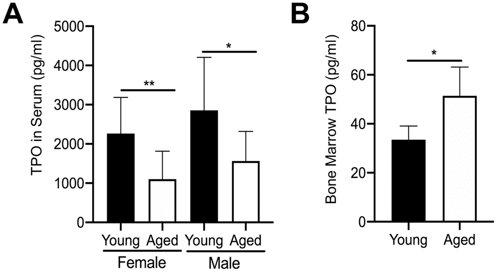 We further examined the mechanism leading to the increase in MK number in aged male and female mice by quantifying extracellular TPO levels. We first quantified TPO in serum from aged versus young mice using a specific ELISA. In addition, given that bone marrow MKs are likely to be influenced by changes in local paracrine factors, we also isolated bone marrow supernatant from hindlimbs of young and aged mice. However, due to the small amount of bone marrow supernatant recovered, male and female mice were combined. As shown in Figure 3A, TPO was significantly lower in the serum of aged mice versus young mice for both female and male cohorts. In contrast, TPO levels in bone marrow supernatant were significantly higher in aged mice compared to young mice (Figure 3B). These findings may suggest that increased TPO in the bone marrow, combined with increased Mpl expression in MKs, may be driving a localized increase in MK numbers with aging.