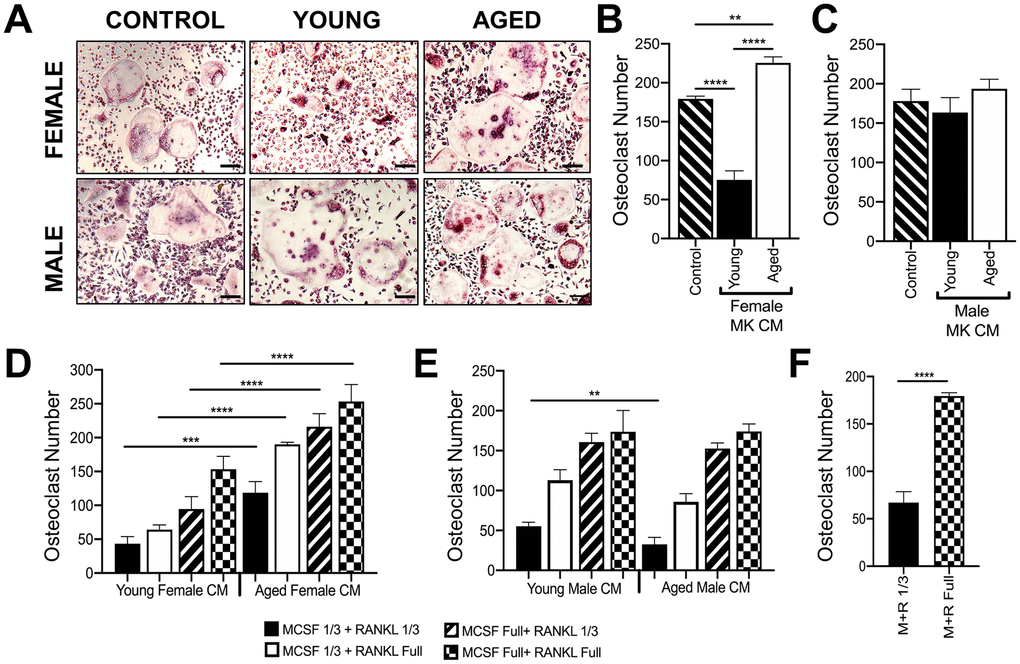 MKs were isolated from young and aged, male and female mice, and used to prepare conditioned media (CM) as described in the methods [14]. Unsorted bone marrow macrophages or BMMs (OC-progenitors) from the bone marrow of 6-10 week-old mice were then cultured in media containing 25% (v/v) MK CM plus RANKL (80 ng/ml) and M-CSF (20 ng/ml). Control media containing only RANKL and M-CSF was also used. Figures 5A, 5B show that OC formation was lower in cultures containing CM from female young MKs compared to control media, confirming that MKs inhibit osteoclastogenesis as we reported previously [14]. In contrast, cultures containing female aged MK CM produced significantly more OCs than young female MK CM (p<0.0001) or control media (p<0.01). On the other hand, as illustrated in Figure 5C, male MK CM showed no significant effect on OC formation whether or not MKs were derived from young or aged mice (p>0.05).