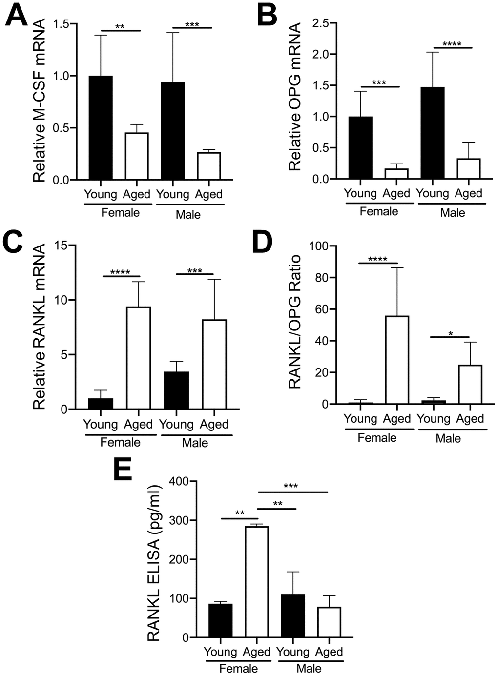 The importance of RANKL and M-CSF for osteoclastogenesis is well established [29, 30]. OC numbers are also affected by osteoprotegerin (OPG) which blocks the ability of RANKL to bind to the RANK receptor on OC precursors [31]. Furthermore, as aging progresses, the level of RANKL in whole bone and in cultured bone marrow cells from both humans and rodents gradually increases [32]. Therefore, we examined whether MKs from young and aged mice express different mRNA levels of these cytokines. As shown in Figure 6A, 6B, MKs from aged female or male mice showed reduced expression of M-CSF (Figure 6A) and OPG (Figure 6B) compared to sex-matched young mice. However, RANKL mRNA (Figure 6C) was markedly higher in MKs from aged mice compared to young mice, for both females and males. Moreover, the ratio of RANKL/OPG (Figure 6D) was increased in MKs from aged mice, suggesting increased potential to induce osteoclastogenesis compared to MKs from young mice. We next confirmed whether MKs secrete RANKL, as determined by specific ELISA. Consistent with an increase in RANKL mRNA, we observed that MKs from aged female mice secrete RANKL at significantly higher levels than MKs from young female mice, young male mice, as well as aged male mice (Figure 6E). Together, these data suggest that MKs from aged female mice may stimulate OC formation through increased RANKL signaling.