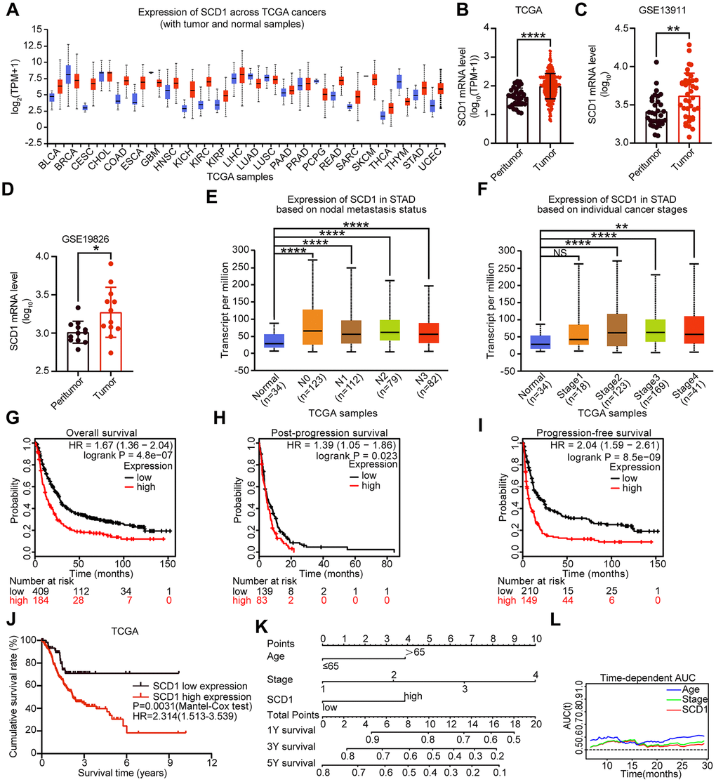 To determine the expression of SCD1 in different cancer types, TCGA database was utilized to identify the mRNA expression level of SCD1. Compared with those in normal tissues, SCD1 mRNA expression was dysregulated in most kinds of cancer tissues, such as in BLCA, CESC, COAD, ESCA, HNSC, KICH, KIRC, KIRP, STAD (P <0.0001) and so on. On the contrary, SCD1 expression was suppressed in THYM, PCPG, LUAD, GBM and BRCA (Figure 1A, 1B). To further validate the SCD1 expression in gastric cancer, GEO databases (GSE13911 and GSE19826) were determined to validation. As expected, the SCD1 mRNA expression was higher in gastric cancer tissues than that in normal ones (P <0.01 and P <0.05; Figure 1C, 1D). Furthermore, SCD1 expression was higher in each status of lymph node metastasis than that in normal tissues (Figure 1E). Additionally, the gastric cancer patient belongs to AJCC stage I had no higher expression of SCD1 than those in normal ones, while AJCC stage II, III and IV groups had relatively higher expression of SCD1 (Figure 1F). The exotic expression of genes might play vital roles in cancers [9], and Kaplan-Meier analysis revealed that SCD1 high-expressed patients have relatively less-optimistic prognostic outcome in terms of overall survival (OS), post-progression survival (PPS) and progression-free survival (PFS) (OS: P <0.0001, HR = 1.67 (1.36-2.04); PPS: P = 0.023, HR = 1.39 (1.05-1.86); PFS: P <0.0001, HR = 2.04 (1.59-2.61); Figure 1G–1I). Meanwhile, the TCGA-STAD dataset also confirmed that SCD1 high-expressed patients had relatively shorter overall survival time (SCD1 high-expressed group: 3.85 ± 0.42 months, SCD1 low-expressed group: 7.10 ± 0.60 months; P=0.0031, HR: 2.314, 95% CI: 1.513-3.539; Figure 1J).