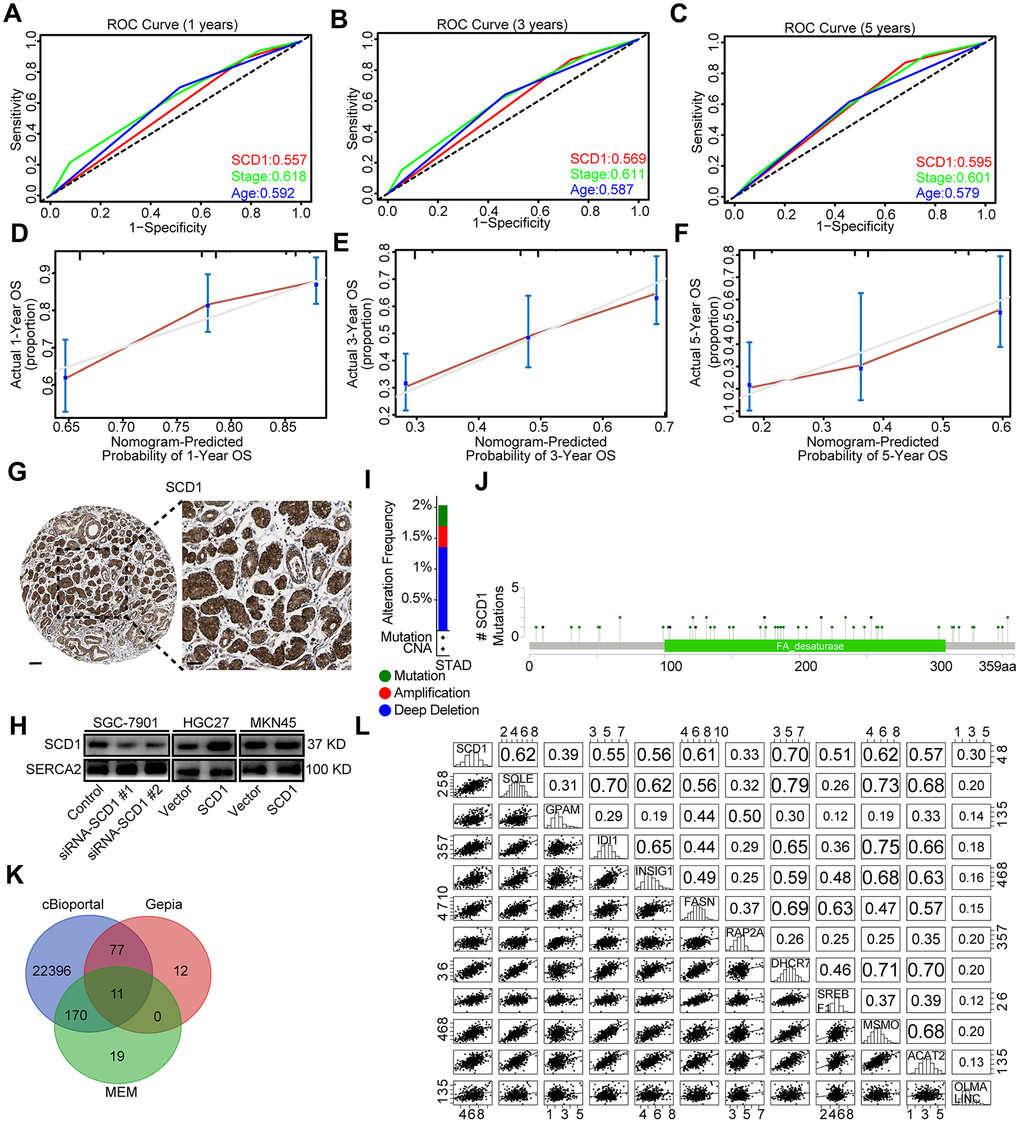 To evaluate the prognostic value of SCD1 more comprehensively, the analysis of time-dependent area under the curve (AUC) were performed. The AUC value at 1, 3, and 5 years showed that SCD1 exhibited relatively high C-index values (1-year: 0.557, 3-year: 0.569, and 5-year: 0.595; Figures 1L, 2A–2C). To generate a more accurate predictive model, the SCD1, AJCC Stage and Age were utilized to construct a prognostic nomogram, and the C-index for OS prediction of the formulated nomogram in TCGA-STAD database was 0.649 (95% CI: 0.599-0.709; P <0.0001). As shown in Figure 1K, the nomogram predicting 1-, 3- and 5- year overall survival was constructed based on AJCC Stage, Age and SCD1 with hazard ratios. The nomogram calculated the likelihood of survival by adding up the scores identified on the points scale for the three factors. The total score existed on the bottom scale represented the likelihood of 1-, 3- and 5-year survival. The calibration plot for the likelihood of 1-, 3- and 5-year survival showed that optimal agreement between the prediction by nomogram and actual observation (Figure 2D–2F). These results revealed that high expression of SCD1 predicted poor survival in gastric cancer.
