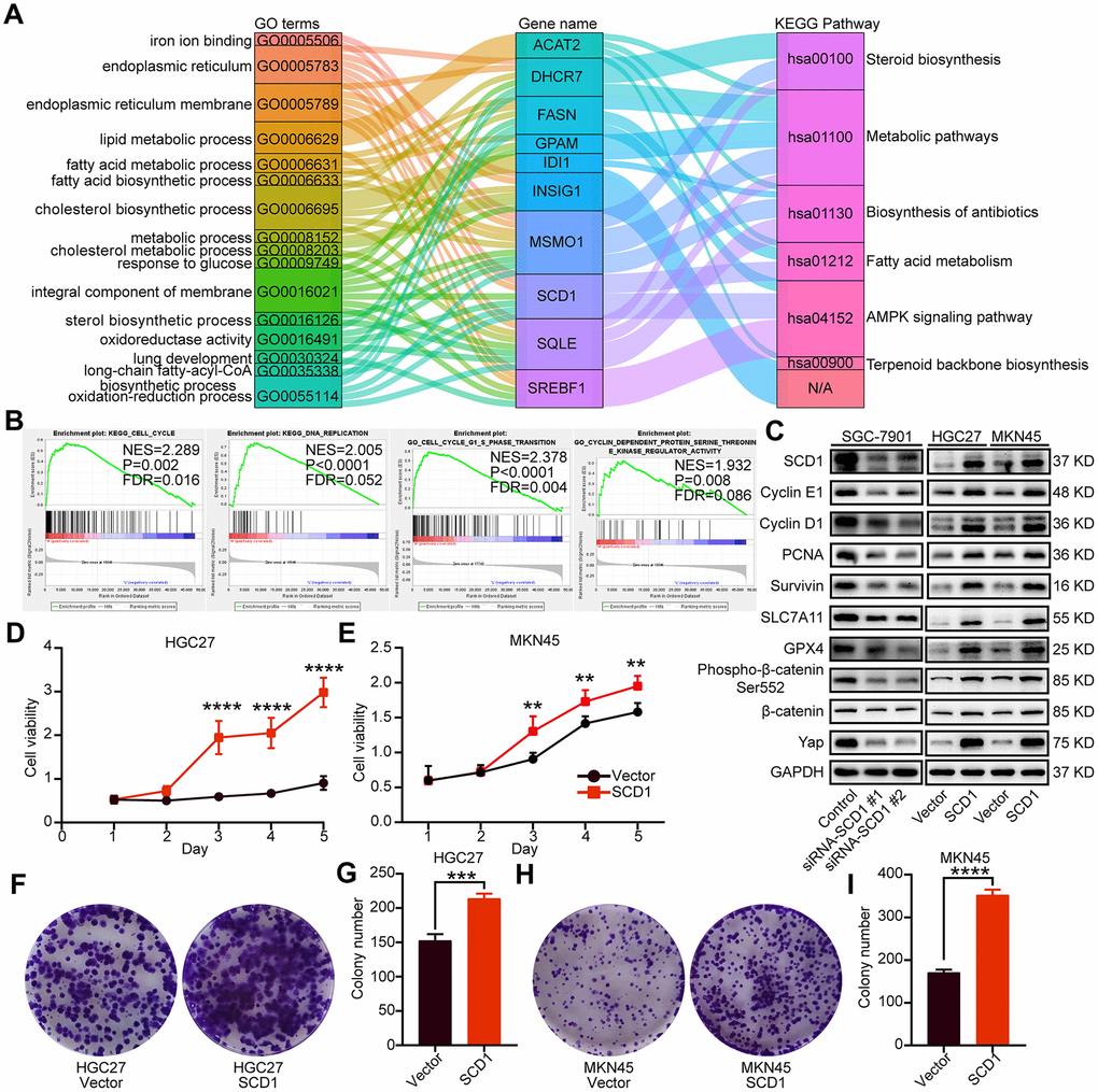 To identify signaling pathways and biological functions uniquely activated by SCD1 gene, GO, KEGG pathway gene sets and SCD1 expression were analyzed with Gene Set Enrichment Analysis (GSEA) software. Notably, the mean value of SCD1 mRNA expression was considered as the optimal cutoff point. GSEA results showed that KEGG_CELL_CYCLE, KEGG_DNA_REPLICATION, GO_CELL_CYCLE_G1_S_PHASE_TRANSITION AND GO_CYCLIN_DEPENDENT_PROTEIN_SERINE_THREONINE_KINASE_REGULATOR_ACTIVITY were enriched in SCD1 high–expressed group (P=0.002, P<0.0001, P<0.0001 and P=0.008; Figure 3B). To validate the function of SCD1 in items mentioned above, SCD1 over-expressed gastric cancer cell models (MKN45-SCD1 and HGC27-SCD1) as well as SCD1 down-regulated gastric cancer cell models (SGC-7901-siRNA-SCD1 #1 and #2) were constructed. As shown in Figure 3C, SCD1 elevated the expression level of cyclin D1 and cyclin E1, which were the markers of “G1-S phase transition”. Additionally, the expression of proliferation-related marker (PCNA), anti-apoptosis marker (Survivin) and anti-ferroptosis markers (SLC7A11 and GPX4) were also enhanced by SCD1. The Wnt-β-catenin signaling pathway and Hippo pathway have been confirmed to be regulated by SCD1 in multiple cancer types [11]., the markers of these two signaling pathways had been validated in gastric cancer cells in this study. As expected, SCD1 could up-regulate the expression of Yap and β-catenin as well as the phosphorylation level of β-catenin (Ser-552). In vitro cell growth assay also confirmed that SCD1 could enhance the cell proliferation and colony-formation ability of gastric cancer cells (proliferation: HGC27: day5 P<0.0001, MKN45 day5 P<0.01; Colony formation: HGC27 vector: 152.7 ± 5.364, HGC27 SCD1: 214.0 ± 4.041 P<0.001, MKN45 vector: 171.0 ± 3.786, MKN45 SCD1: 352.7 ± 7.055 P<0.0001; Figure 3D–3I). Treated with 1 μM Erastin for 24 hours, the cell death level and lipid oxidation of HGC27, MKN45 and SGC-7901 cells as characteristic features of ferroptosis, were examined and results showed that SCD1 prevented ferroptotic cell death in gastric cancer cells (cell death level: HGC27 vector: 17.72 ± 0.265%, HGC27 SCD1: 6.63 ± 1.153% P<0.001, MKN45 vector: 18.90 ± 1.535%, MKN45 SCD1: 5.36 ± 0.328% P<0.001, and SGC-7901 Control: 33.83 ± 2.114%, SGC-7901 siRNA SCD1 #1: 57.17 ± 5.239% P<0.01, SGC-7901 siRNA SCD1 #2: 54.13 ± 2.842% P<0.05; lipid oxidation: HGC27 vector: 32.80 ± 1.514%, HGC27 SCD1: 13.97 ± 1.235% P<0.001, MKN45 vector: 27.80 ± 1.249%, MKN45 SCD1: 14.30 ± 0.529% P<0.001, and SGC-7901 Control: 11.47 ± 0.145%, SGC-7901 siRNA SCD1 #1: 30.23 ± 1.637% P<0.0001, SGC-7901 siRNA SCD1 #2: 32.00 ± 1.422% P<0.0001 Figure 4A–4F).