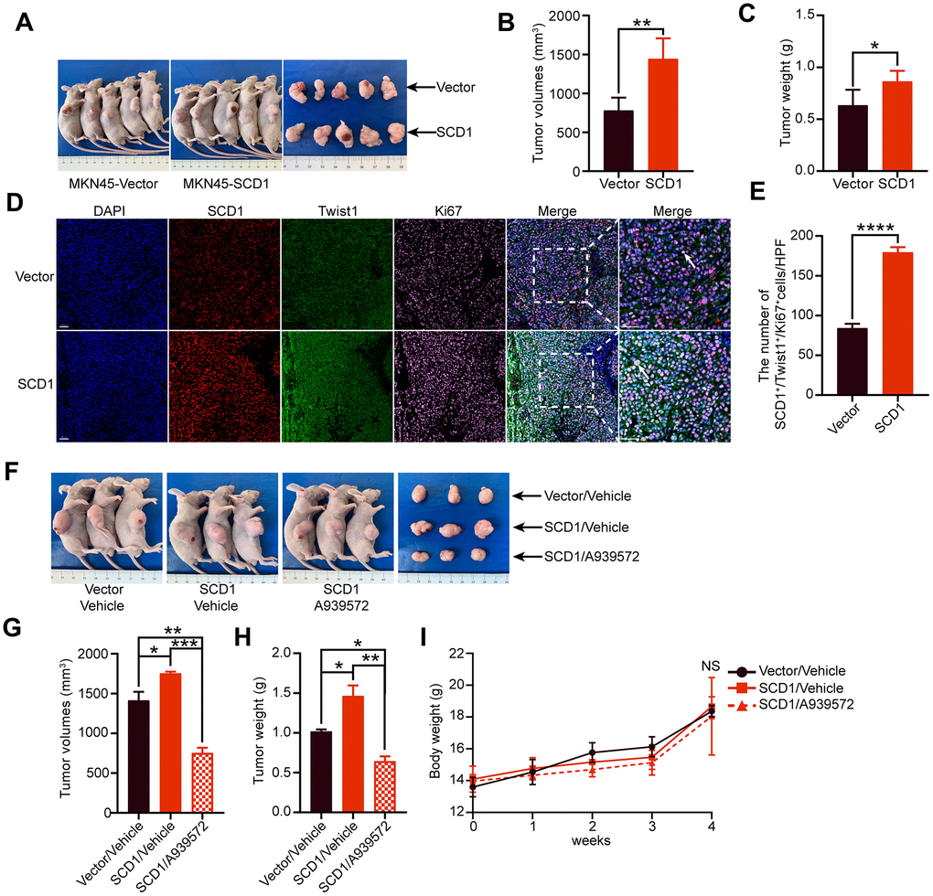 To investigate the effect of SCD1 on the tumorigenesis of gastric cancer cells in vivo, the xenograft mice model was constructed and relevant results revealed that SCD1 promoted tumor formation (MKN45-Vector: 779.9 ± 73.670 mm3, MKN45-SCD1: 1444 ± 117.300 mm3; P <0.01, Figure 5A, 5B). Similar to the tendency in tumor volume, the tumor weight of xenografts derived from the MKN45-SCD1 groups were significantly heavier than those of xenografts originating from littermate controls (MKN45-Vector: 0.634 ± 0.067 g, MKN45-SCD1: 0.864 ± 0.045 g; P <0.05, Figure 5C). To assess SCD1 activation in gastric cancer at a larger scale, we performed immunofluorescent staining for SCD1, Twist1 and Ki67 of paraffin-embedded tissue sections from MKN45-SCD1 xenografts and control ones. Interestingly, tumor tissues from MKN45-SCD1 mice showed a significantly increased number of Twist1+ and Ki67+ cells, indicating SCD1 enhanced proliferation and metastasis as compared with tumor tissues from control ones (MKN45-Vector: 84.200 ± 2.478, MKN45-SCD1: 179.400 ± 2.926, P <0.0001; Figure 5D, 5E).