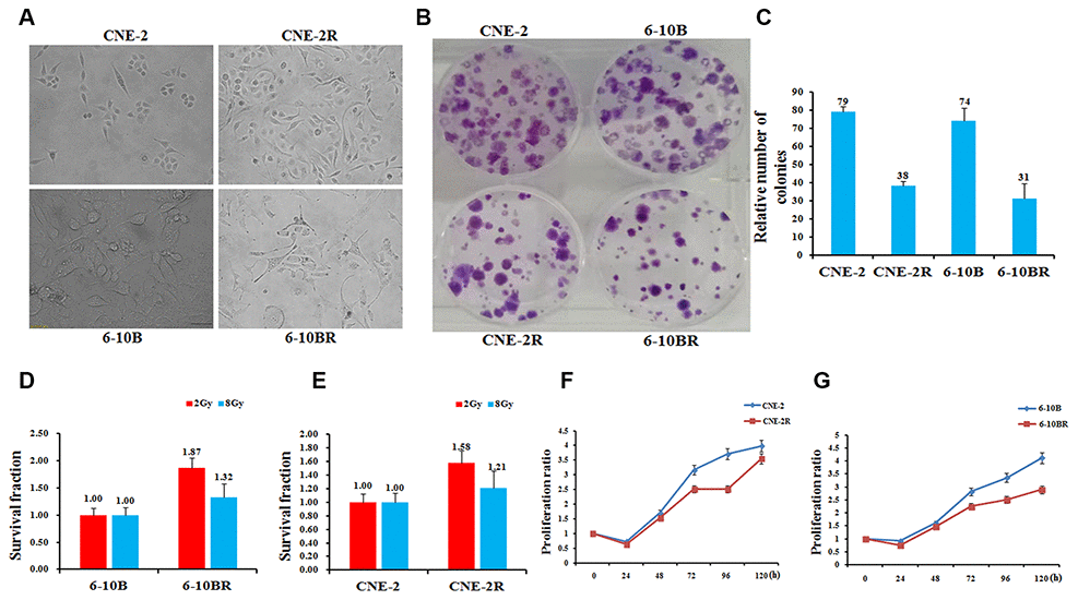 We then compared the features of these two new cell lines to their parental cells by a series of biochemical assays. The sphere formation assays showed that the CNE-2R and 6-10BR cells possess only half number of the colonies compared to their parental cells (Figure 1B and 1C). Next, we detected the radio-sensitivity of CNE-2R and 6-10BR cells. Upon radio treatment at 2Gy and 8Gy, respectively, both CNE-2R and 6-10BR cells showed an increased survival fraction, compared to their parental cells (Figure 1D and 1E). The results showed that CNE-2R and 6-10BR cells indeed confer the capability of radio-resistance, and thus has a lower sensitivity against radio treatment. Moreover, the cell proliferation assays showed that CNE-2R and 6-10BR cells have a lower proliferation rate compared to their parental cells (Figure 1F and 1G). All these results clearly demonstrated that the radio-resistant cells CNE-2R and 6-10BR showed a substantial difference compared to the parental cells.