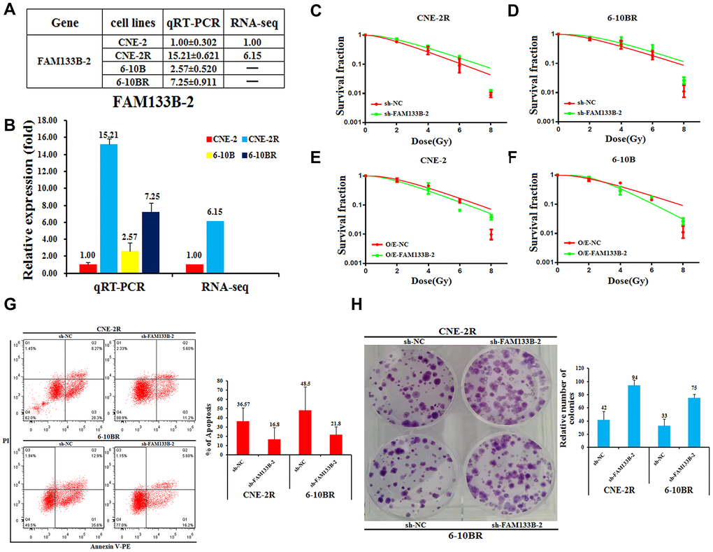To find the molecular insights that involve in the radio-resistance of NPC cells, we performed the lncRNA-seq analysis of radio-sensitive CNE-2 and radio-resistant CNE-2R cells, and compared the differentially expressed genes. The results gave several lncRNAs that differ at least 2-folds of the expression in the two cells. Among them, FAM133B-2 is one of the most significantly differentially expressed genes, which has a 6-fold higher expression in CNE-2R compared to CNE-2 cells (Figure 2A and 2BSupplementary Figures 1, 3). Moreover, the qRT-PCR analysis showed that the expression of FAM133B-2 is much higher in the radio-resistant CNE-2R and 6-10BR cells, which are 15.21- and 2.82-folds compared to CNE-2 and 6-10B, respectively (Figure 2A and 2B).