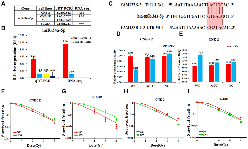 Previous reports suggested that lncRNAs could act as competing endogenous RNAs (ceRNAs) to sponge miRNAs and thus regulate cancer progression [18, 19]. We proposed that FAM133B-2 might be a ceRNA to sponge miRNA. Moreover, we previously found that the miRNA miR-34a-5p involves in the radio- or drug-resistance of cancers [20, 21]. To test whether miR-34a-5p involves in the NPC radio-resistance, we first tested the expression of miR-34a-5p in the NPC cells by RNA-seq and qRT-PCR analysis Supplementary Figure 3. The results showed that the miR-34a-5p level is much higher in the radio-sensitive CNE-2 and 6-10B cells, compared to the radio-resistant CNE-2R and 6-10BR cells (Figure 3A and 3B). The expression of miR-34a-5p is negatively correlated with the FAM133B-2 level in the NPC cells, indicating FAM133B-2 might be a target of miR-34a-5p. Sequence analysis showed that the 3’-UTR region of FAM133B-2 has a sequence motif that is complementary with miR-34a-5p (Figure 3C). We thus performed the luciferase reporter assays by constructing the wild-type or miR-34a-5p binding-site mutant of FAM133B-2 in the plasmid. We then tested the luciferase activity by transfecting the miR-34a-5p mimic in the CNE-2R cells or the miR-34a-5p antagomiR in the CNE-2 cells. Upon the up-regulation of miR-34a-5p in the CNE-2R cells, the luciferase activity was reduced to about half of the level in the wild-type cells, indicating a reduced expression of FAM133B-2 (Figure 3D). However, mutation of the miR-34a-5p binding site in FAM133B-2 almost abolished the reducing effect, which showed a comparable luciferase activity (Figure 3D). In contrast, down-regulation of miR-34a-5p in the CNE-2 cells increased the expression of FAM133B-2 to 1.5 folds compared to the control. As expected, mutation of the miR-34a-5p binding site in FAM133B-2 also has a minor effect on the FAM133B-2 expression in CNE-2 cells (Figure 3E). All these results suggested that FAM133B-2 is a target of miR-34a-5p in NPC cells, which negatively regulates the expression of FAM133B-2.