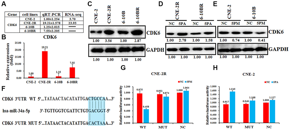 The cyclin-dependent kinase 6 (CDK6) was found to involve in the drug resistance [22–24]. Moreover, we found that CDK6 mRNA level is higher in the radio-resistant CNE-2R and 6-10BR cells, compared to the radio-sensitive CNE-2 or 6-10B cells (Figure 4A and 4BSupplementary Figure 3). The western blot analysis also showed a higher protein level in CNE-2R or 6-10BR cells (Figure 4C). The CDK6 level is negatively correlated with the miR-34a-5p level, indicating CDK6 might be a target of miR-34a-5p. To further validate this hypothesis, we tested the CDK6 protein expression by transfecting the miR-34a-5p antagomiR in the CNE-2R and 6-10BR cells, or the miR-34a-5p mimic in the CNE-2 and 6-10B cells. As a result, miR-34a-5p knockdown increased the CDK6 protein level by 2.78- and 1.58-folds in CNE-2R and 6-10BR cells, respectively (Figure 4D). Moreover, up-regulation of miR-34a-5p decreased the CDK6 protein level to 74% and 41% in CNE-2 and 6-10B cells, respectively (Figure 4E).