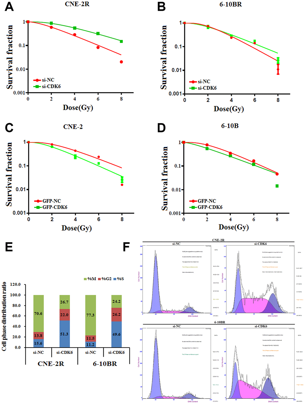 Furthermore, we analyzed the cell cycle distribution by CDK6 knockdown in CNE-2R and 6-10BR cells. Most of the control cells are in the mitotic period, whereas CDK knockdown triggers half of the cells synchronized in the S phase (Figure 5E and 5F). The results indicated that CDK6 affects the cell cycle, which eventually might associate with the NPC radio-resistance.