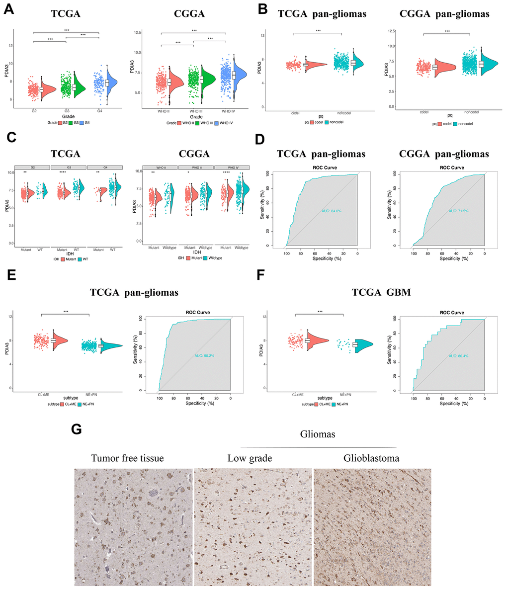 Subsequently, we evaluated inter-tumor and intra-tumor heterogeneous characteristics of PDIA3 in gliomas. Based on transcriptomic and genomic dimensions, molecular classification of human gliomas was divided into several subtypes, including classical (CL), mesenchymal (ME), pro-neural (PN), and neural (NE) [32]. CL and ME subtypes are more aggressive compared to PN or NE subtypes [33]. As shown in Figure 1E, increased PDIA3 expression was more correlated with the CL and ME subtypes than PN and NE subtypes in pan-glioma samples. Meanwhile, the area under the curve (AUC) was 80.4% with regard to CL and ME subtypes in GBM samples (Figure 1F), indicating that PDIA3 served as an effective predictor for CL and ME subtypes.