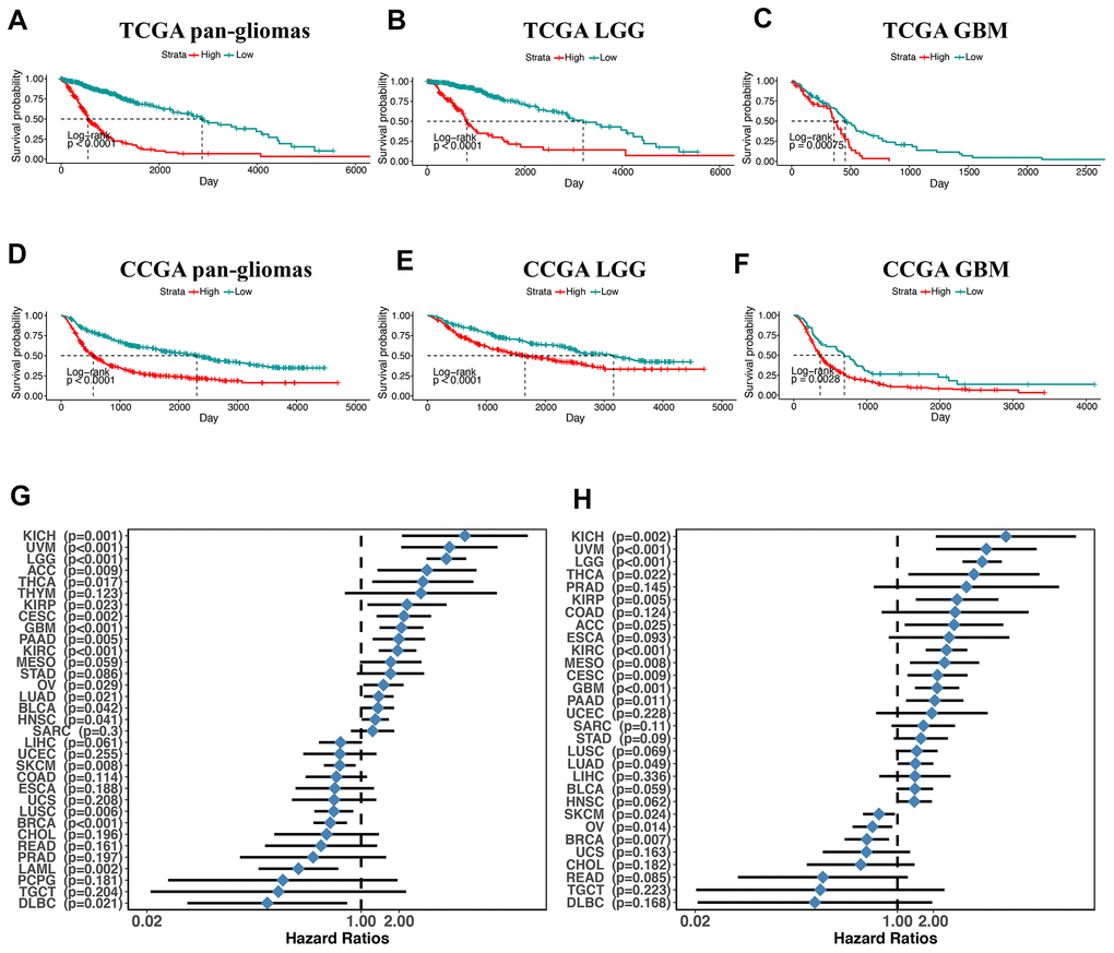 Next, we utilized Kaplan-Meier analysis to investigate the prognostic value of PDIA3 expression in human gliomas. In pan-glioma analysis of both TCGA and CGGA datasets, the overall survival (OS) of patients with high PDIA3 expression was significantly lower than that of patients with low PDIA3 expression (Figure 2A, 2D). Similar results were also observed in LGG and GBM patients (Figure 2). In addition, higher PDIA3 expression was associated with worse progression-free survival (PFS) and disease-specific survival (DSS) among pan-glioma patients, LGG, and GBM patients (Supplementary Figure 3). In pan-cancer analysis, PDIA3 indicated worse OS and DSS in adrenocortical carcinoma (ACC), breast invasive carcinoma (BRCA), kidney Chromophobe (KICH), kidney renal clear cell carcinoma (KIRC), kidney renal papillary cell carcinoma (KIRP), lung adenocarcinoma (LUAD), ovarian serous cystadenocarcinoma (OV), pancreatic adenocarcinoma (PAAD), skin Cutaneous Melanoma (SKCM), thyroid carcinoma (THCA), and uveal Melanoma (UVM) (Supplementary Figures 4, 5). The prognostic value of the PDIA3 in pan-cancer was also assessed. The heterogeneous results indicated that the PDIA3 was a hazardous prognostic marker in eighteen independent tumor cohorts and a favorable prognostic marker in fifteen independent tumor cohorts including melanoma in regard to OS (Figure 2G). Similar results were observed in the analysis in regard to DSS (Figure 2H). These results revealed that PDIA3 might serve as a biomarker to predict the poor prognosis in gliomas.