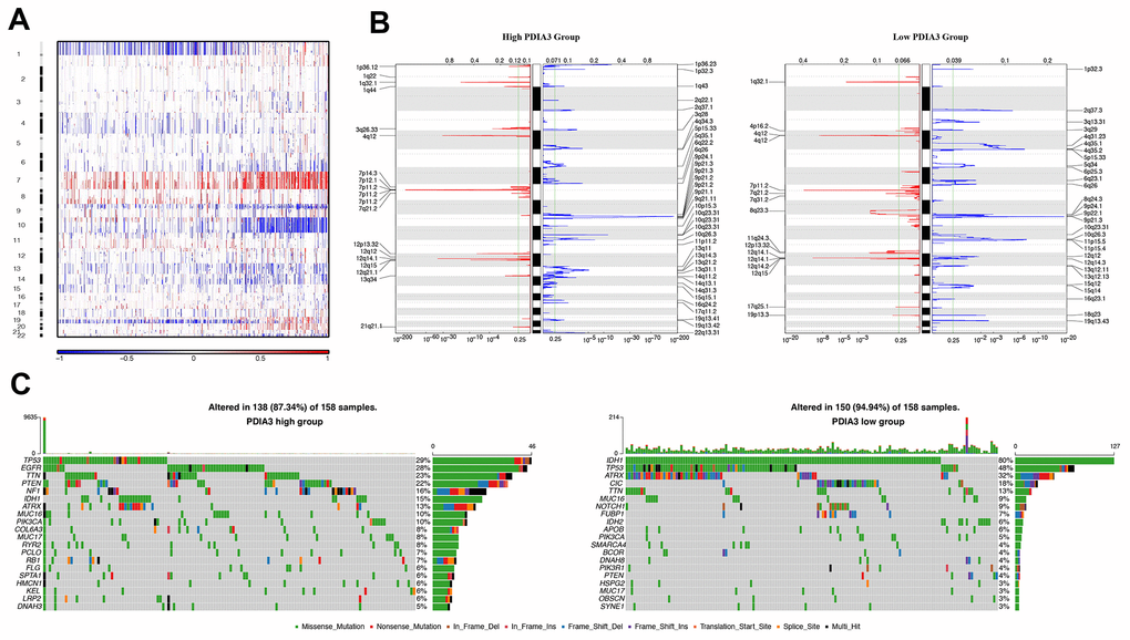In order to figure out the association between PDIA3 expression levels and gliomas genomic profiles, CNA and somatic mutation analysis were performed in TCGA dataset. A global CNA profile was observed from the comparison of clusters with low PDIA3 expression (n = 158) and high PDIA3 expression (n = 158) (Figure 3A, 3B). The high PDIA3 expression cluster frequently showed amplification of chr7 and deletion of chr10, both of which were typical genomic events in GBM (Figure 3A); while deletion of 1p and 19q, a genomic hallmark of oligodendroglioma, occurred more frequently in PDIA3 low cluster (Figure 3B). In high PDIA3 expression samples, frequently amplified genomic regions, containing oncogenic driver genes such as PDGFRA (4q12), EGFR (7p11.2) and CDK4 (12q14.1), were accompanied by CDKN2A/CDKN2B (9p21.3) and PTEN (10q23.3) deletion peaks. Furthermore, analysis of somatic mutation profiles indicated a high frequency of mutations in EGFR (28%), TTN (23%), PTEN (22%) and NF1 (16%) in the high PDIA3 expression cluster, while IDH1 (80%), ATRX (32%), CIC (18%) were more frequently mutated in the PDIA3 low expression cluster (Figure 3C).