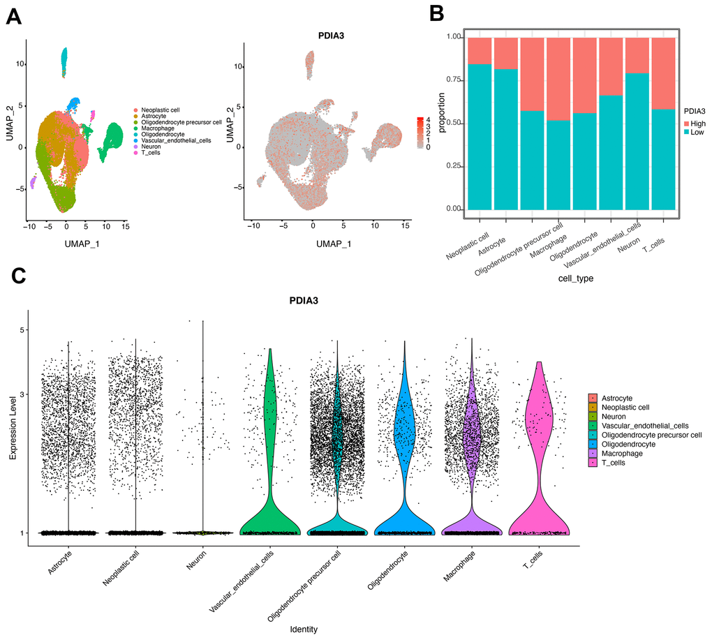 This study was ethically approved by Xiangya Hospital, Central South University. From the The Cancer Genome Atlas (TCGA) and Chinese Glioma Genome Atlas (CGGA) datasets, we collected PDIA3 data from low grade glioma (LGG) and GBM samples. 672 samples from TCGA were downloaded from UCSC Xena (https://xenabrowser.net/). 1013 samples from CGGA were downloaded from CGGA website (http://www.cgga.org.cn/). RNA-seq data in regard to specific tumor anatomic structure in GBM was downloaded from Ivy Glioblastoma Atlas Project (http://glioblastoma.alleninstitute.org/). PDIA3 expression data in different radiographical regions of normal brain and GBM was downloaded from the Gill dataset. Immunohistochemical images with regard to PDIA3 were downloaded from https://www.proteinatlas.org. Single-cell expression matrices were obtained from the Gene Expression Omnibus (GEO; https://www.ncbi.nlm.nih.gov/) GSE138794 [53], which performed single-cell/nuclei RNA-sequencing of 28 gliomas. 8 scRNA sequeencing datasets including both LGG and high grade glioma (HGG) were used for analysis.