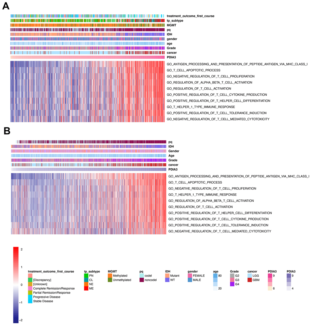 Several studies have demonstrated that PDIA3 might play an important role in facilitating the efficacy of T cell-based immunotherapies [27, 40, 41]. To confirm whether PDIA3 was involved in T cell immunity, we performed GSVA analysis in TCGA cohort and found that PDIA3 was correlated with negative regulation of T cell mediated cytotoxicity and negative regulation of T cell proliferation (Figure 6A). On the contrary, PDIA3 was positively correlated with antigen processing and presentation of peptide antigen via MHC class I molecules, regulation of alpha beta T cell activation, regulation of T cell activation, positive regulation of T cell tolerance induction, positive regulation of T cell cytokine production, T helper 1 type immune response, and positive regulation of T helper cell differentiation. These results was subsequently verified in CGGA cohorts (Figure 6B). Thus, PDIA3 might serve as a crucial mediator in suppressing T cell related anti-tumor immune response in the glioma microenvironment.