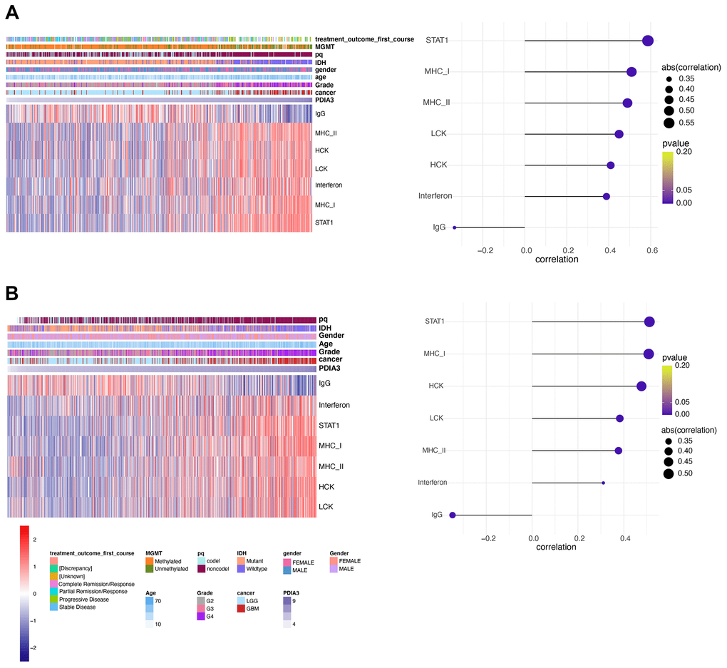 Since our analysis demonstrated that PDIA3 was correlated with inflammation in gliomas, we subsequently examined seven genes to identify the association of PDIA3 with these inflammatory activity signatures [44]. PDIA3 expression was positively correlated with HCK, LCK, MHC-I, MHC-II, STAT1, and interferon, but negatively related to IgG in pan-glioma (Figure 8A, 8B) and GBM (Supplementary Figure 8) analysis based on both TCGA and CGGA datasets. These data showed that PDIA3 was abundant in macrophages activation, signal transduction of T cells and antigen-presenting cells, while negatively interacted with B lymphocytes-related genes. Thus, we also confirmed that PDIA3 served as a pivotal molecule in immune and inflammatory progression of gliomas.
