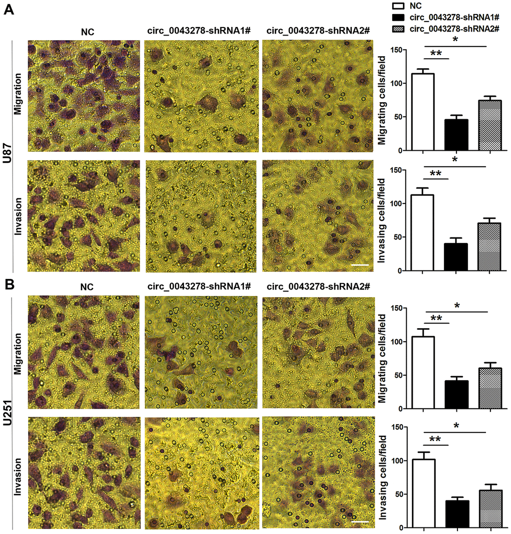 The qRT-PCR analysis was performed in 30 pairs of human glioma tissues and their adjacent non-tumor tissue samples to confirm circ_0043278 expression in GBM. Circ_0043278 expression level was increased significantly in 30 glioma tissues compared to adjacent non-tumor tissues (t(29)=3.594, p=0.0012, Figure 1A). Moreover, circ_0043278 expression was higher in III–IV grade glioma tissues than in I–II grade tissues (t(28)=2.106, p=0.044, Figure 1B). Circ_0043278 expression was analyzed in human GBM cell lines. Circ_0043278 was higher in four glioma cell lines (A172, U251, U87, and U373) than in normal human astrocytes (NHAs) (F(4,10)=8.776, p=0.003). Among the four glioma cell lines, U87 and U251 cells exhibited the highest circ_0043278 levels (Figure 1C). Two circ_0043278 small hairpin RNA (shRNA1# or 2#) products were designed to specifically target circRNA junction sites, while negative control (NC) products were used as a control. They were then transfected into U87 cells and assessed using qRT-PCR. Circ_0043278 expression was significantly silenced by shRNAs (F(2,6)=17.51, p=0.003), while circ_0043278-shRNA1# had the best knockdown efficiency (Figure 1D). CCK-8 assay determined that silencing circ_0043278 inhibited cell proliferation both in U87 and U251 cells after 24 h (F(2,6)=0.642, p=0.559; F(2,6)=4.995, p=0.053; respectively), 48 h (F(2,6)=8.564, p=0.018; F(2,6)=8.471, p=0.018; respectively), and 72 h (F(2,6)=14.90, p=0.005; F(2,6)=16.16, p=0.004; respectively; Figure 1E and 1F). Furthermore, RNA fluorescence in situ hybridization (FISH) suggested that circ_0043278 was mainly localized in the U87 and U251 cell cytoplasm (Figure 1G). Additionally, transwell assays showed that circ_0043278 knockdown significantly reduced both U87 cell migration (F(2,6)=22.04, p=0.002)and invasion (F(2,6)=16.57, p=0.004) and U251 cell migration (F(2,6)=13.89, p=0.0026) and invasion (F(2,6)=13.50, p=0.006; Figure 2A and 2B). These results demonstrated that knockdown circ_0043278 inhibits the proliferation, migration, and invasion of GBM cells.