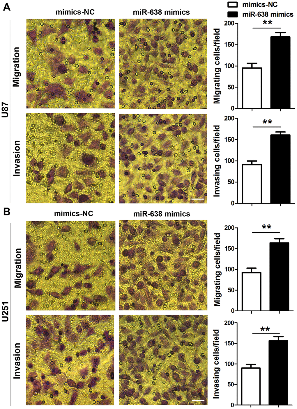 Zheng et al. reported that miR-638 expression is down-regulated in glioma tissues compared to normal tissues [22]. The current study also revealed a significantly lower miR-638 expression in glioma tissues compared to adjacent non-tumor tissues (t(29)=3.595, p=0.0012, Figure 3A). Moreover, this expression was lower in high-grade than in low-grade glioma tissues (t(28)=2.127, p=0.042, Figure 3B). Unlike circ_0043278, miR-638 expression levels in U87, A172, U251, and U373 cells were significantly lower than those in NHAs (F(4,10)=4.330, p=0.027, Figure 3C). Therefore, miR-638 mimics were used to overexpress miR-638 and transfected into both U87 and U251 cells, where cell growth was analyzed using a CCK-8 assay. The results indicated that overexpression of miR-638 increased both U87 and U251 cell proliferation (Figure 3D and 3E) after 24 h (t(4)=1.269, p=0.273; t(4)=1.181, p=0.303; respectively), 48 h (t(4)=2.853, p=0.046; t(4)=3.229, p=0.032; respectively) and 72 h (t(4)=4.754, p=0.009; t(4)=2.797, p=0.049; respectively). Furthermore, transwell assays showed that overexpression miR-638 increased both U87 and U251 cell migration (t(4)=4.912, p=0.008; t(4)=4.894, p=0.008; respectively; Figure 4A) and invasion (t(4)=6.261, p=0.003; t(4)=4.927, p=0.008; respectively; Figure 4B). These results demonstrated that miR-638 overexpression increases the GBM cells proliferation, migration, and invasion.