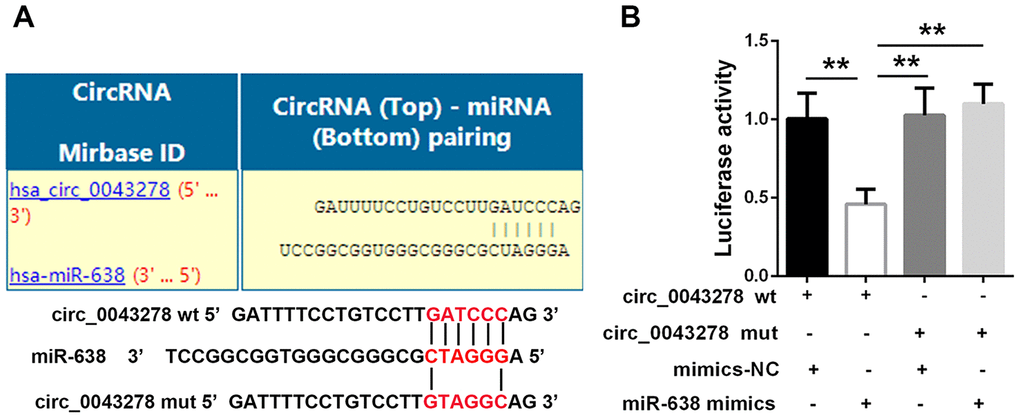 Science that circ-0043278 is predominantly distributed in the cytoplasmic fraction, it was hypothesized that circ-0043278 may act as a competitive endogenous RNA (ceRNA) in biological processes. Based on the online predictions of circ-interactome (https://circinteractome.nia.nih.gov) and analysis using the circ-interactome database, circ_0043278 shares putative binding sites with miR-638 (Figure 5A). To explore a potential interaction between circ-0043278 and miRNA-638, dual-luciferase reporter plasmids carrying a fragment of the mutant (mut) or wild-type (wt) circ-0043278 sequence and the predicted miR-638 recognition site were constructed. Luciferase activity was markedly decreased in 293 cells co-transfected with circ-0043278-wt and miR-638 mimics. However, no significant differences in luciferase activity were present in cells co-transfected with circ-0043278-mut and miR-638 mimics (F(3,8)=12.84, p=0.002, Figure 5B). These results suggest that circ_0043278 sponges miR-638.