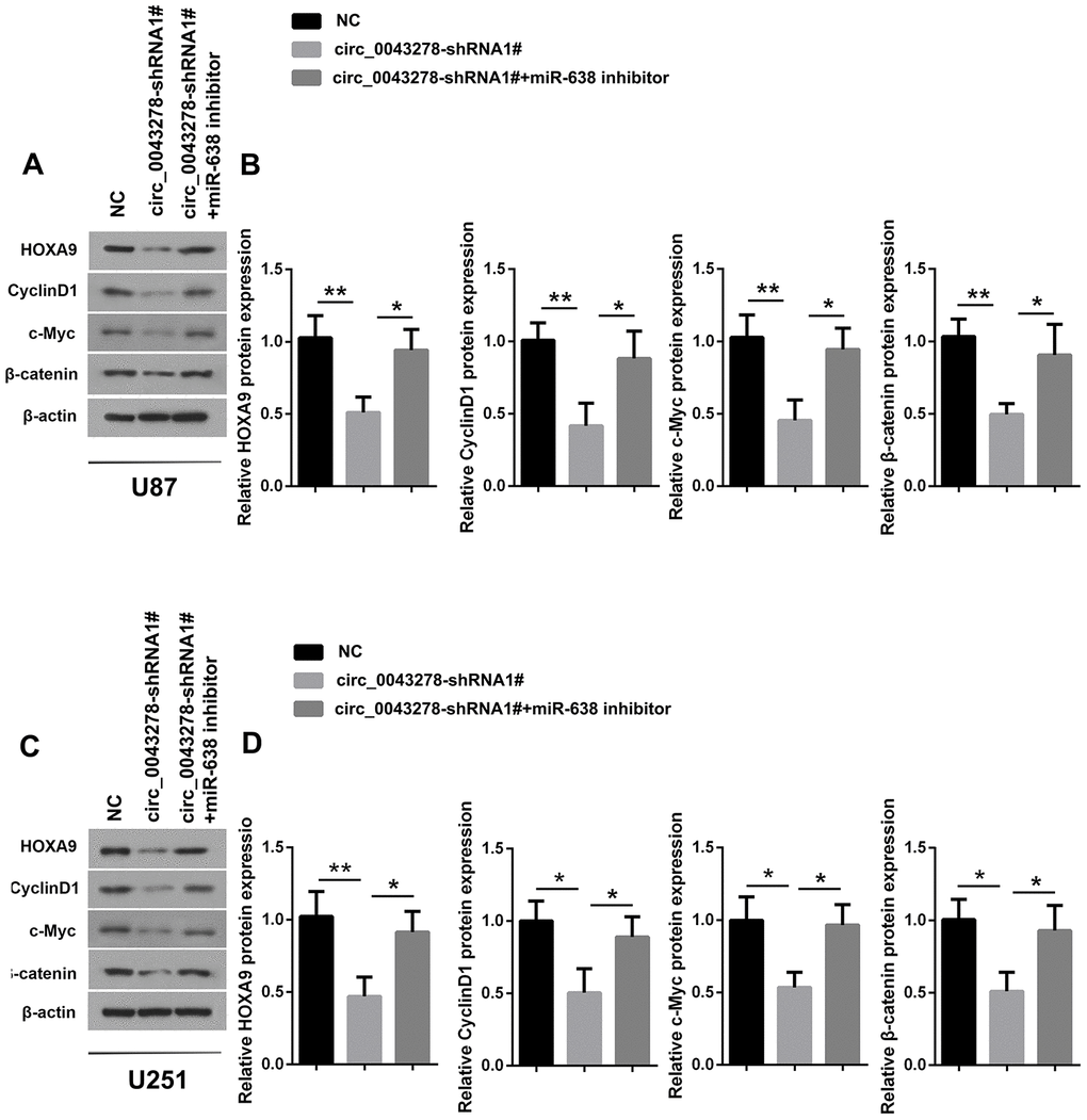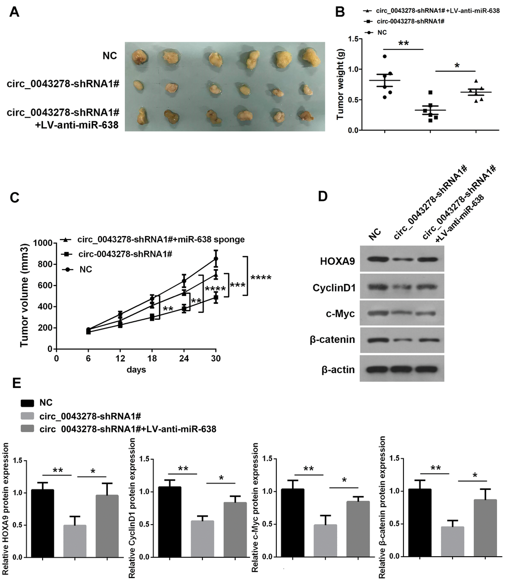 Animal Ethics Committee at the First Hospital of Lanzhou University approved all animal experiments. All protocols were established following provided guidelines. Five-week-old male nude mice were purchased from Shanghai SLAC Laboratory Animal Co. Ltd. (Shanghai, China) and housed in laminar airflow cabinets under pathogen-free conditions. Animals were randomly divided into three groups (NC, circ_0043278-shRNA1# and circ_0043278-shRNA1#+LV-anti-miR-638) (six in each group). Tumor formation was initiated via subcutaneous injection of infected U87 cells (2× 106 cells) into nude mouse flanks. Tumor volume was computer using an equation, where volume = length × width2/2. Tumor volume was measured every six days. After 30 days, mice were euthanized and tumor grafts were excised, weighed, and harvested. Proteins were extracted from the one-half of tumors, and the expression of HOXA9, CyclinD1, c-Myc and β-catenin were measured by WB. The other half was fixed in 4% paraformaldehyde.