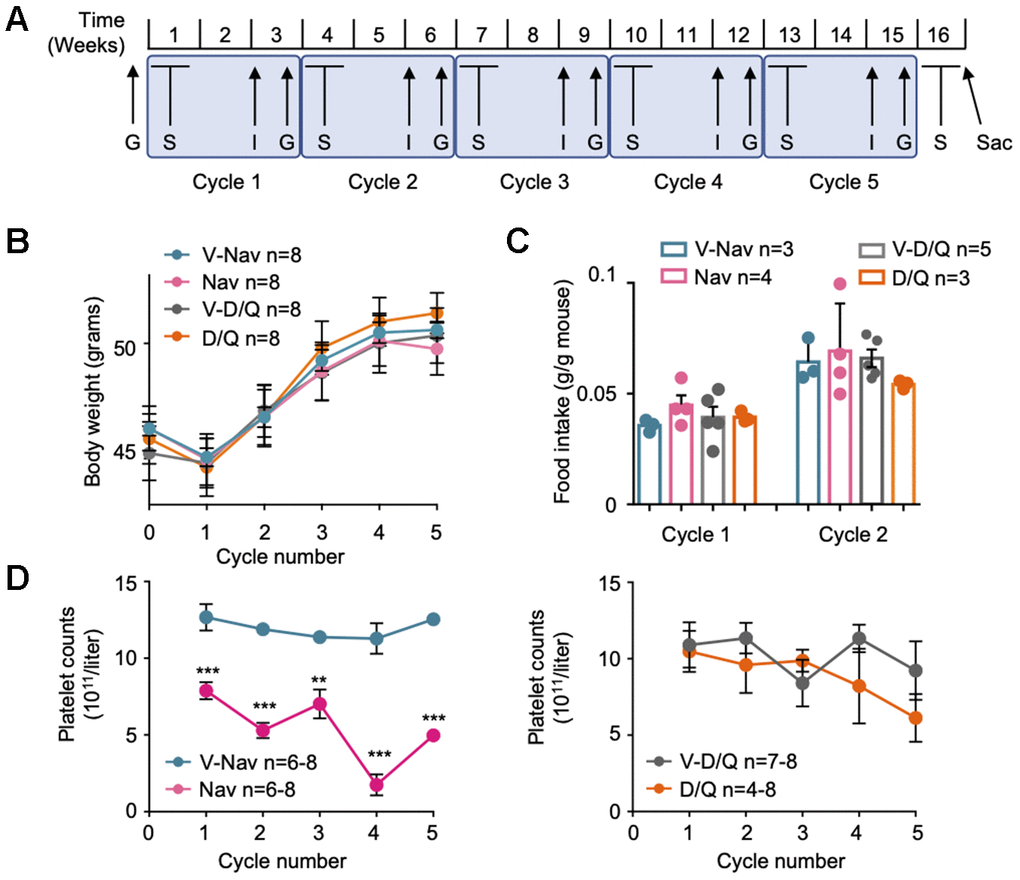 Finally, we verified the effectiveness of navitoclax treatment by following the blood platelet counts during all the cycles. As reported before for mice [26] and humans [27], blood platelet counts measured at the fifth day of navitoclax treatment by oral gavage were significantly decreased, compared with their corresponding control group and with the D/Q mixture and its control (Figure 1D), thus proving that navitoclax was effective in our model system.