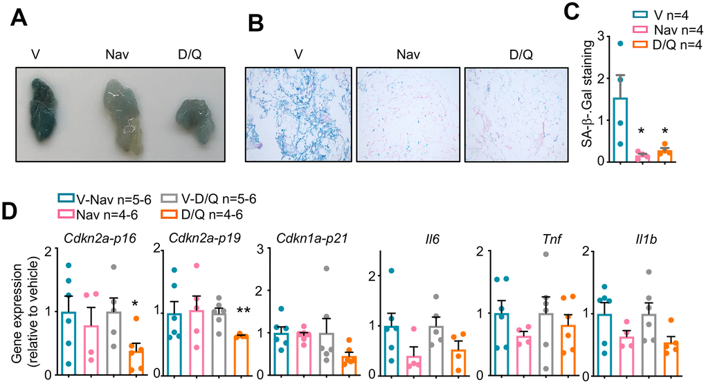 After finishing the 5 cycles of treatment and metabolic phenotyping, we treated again with senolytics for 5 consecutive days by oral gavage and sacrificed right after the last treatment. We focused on perigonadal white adipose tissue (pWAT), because this tissue has been reported to present the most evident induction of senescence after obesity onset [3, 25]. We checked the efficacy of our senolytic treatments by measuring different senescence markers. First, we performed a whole-mount staining for SA-βGal, one of the best described senescence biomarkers [11]. As shown in Figures 2A–2C, after the last 5 days of treatment once all cycles had been finished, pWAT from vehicle-treated mice showed a strong staining for SA-βGal, while treatment with both navitoclax and D/Q significantly reduced the SA-βGal staining. We did not observe any significant changes in the weight of several tissues from these mice, indicating that the senolytic treatments did not induce apparent macroscopic tissue changes (Supplementary Figure 1C). We finally checked the mRNA expression of a number of senescence markers, including the tumor suppressors Cdkn2a-p16, Cdkn2a-p19 and Cdkn1a-p21; and the senescence-associated cytokines Il6, Tnf and Il1b. We observed significant reductions in the pWAT expression of the senescence markers Cdkn2a-p16 and Cdkn2a-p19 after treatment with D/Q, but navitoclax-treated pWAT did not reduce the levels of any of these tumor suppressors. Also, we observed a clear but not significant tendency to reduced expression in the inflammation genes Il6, Il1b and Tnf for both treatments (Figure 2D).