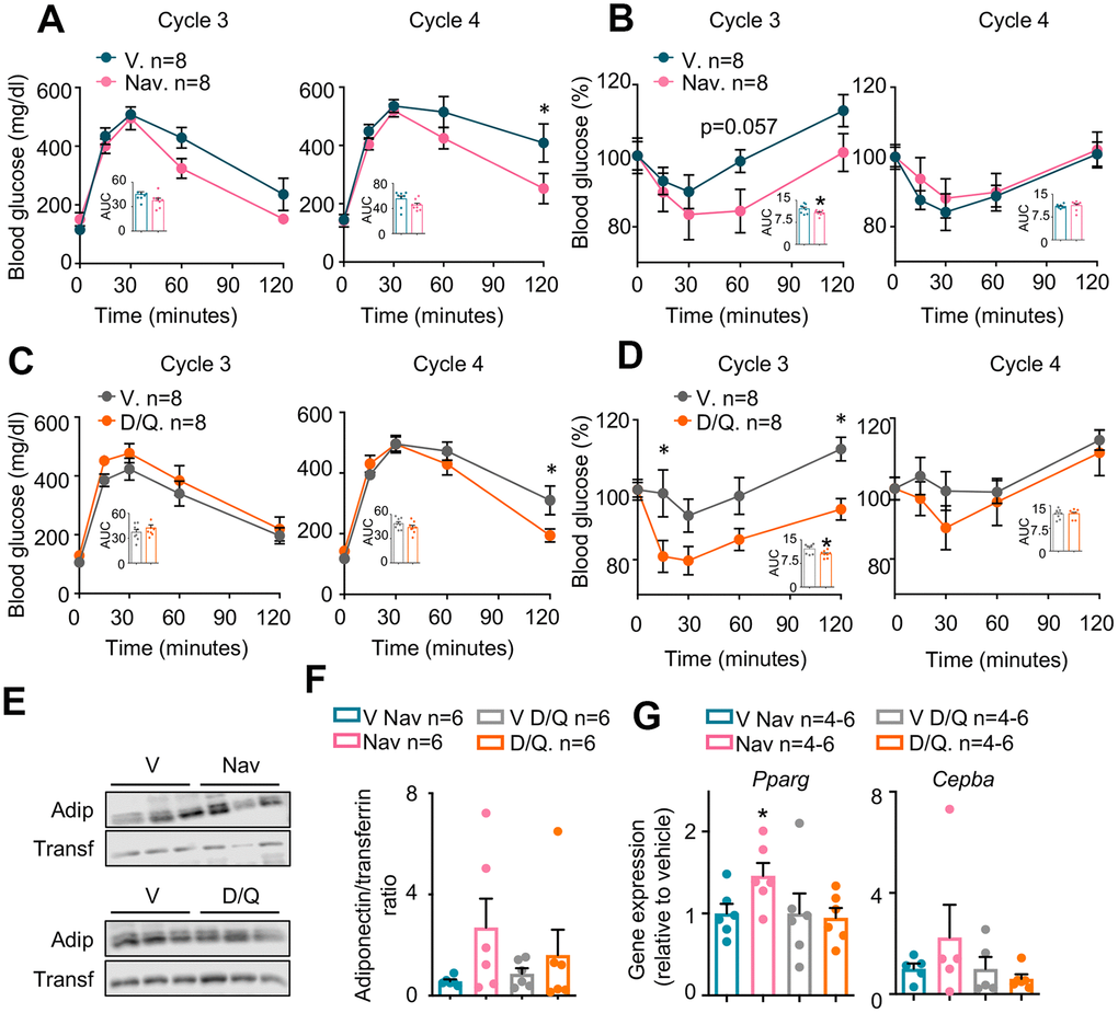 We then analyzed glucose and insulin sensitivity to measure the diabetic profile in our mice after every senolytic cycle. We observed a different behavior of between mice treated with each type of vehicle at the ITT experiments from cycle 3 (Figure 3B, 3D, Supplementary Figure 1E and 1G), probably due to the different composition of both vehicles (15% DMSO + 15% PEG 400 for navitoclax; and 10% PEG 400 for D/Q). In any case, the improved insulin sensitivity of the senolytic-treated mice observed in cycle 3 disappears in later cycles, independently of their vehicles. Therefore, according to our statistically significant results from GTT and ITTs, we conclude that there is a transient improvement in glucose homeostasis in senolytic-treated mice that peaks around cycles 3 and 4. In addition, our data coincide in intensity and time of appearance with previous reports with D/Q [5, 25] (Figure 3A–3D). Navitoclax treatment has already been shown to improve blood fasting glucose levels in a pharmacological type 2 diabetes model of treatment with the insulin receptor antagonist S961 [5]; but it had never been tested with a mouse model of DIO, as presented here. Also, at the fourth cycle we observed a tendency to increased blood adiponectin, an adipokine previously described as an enhancer of insulin sensitivity [38]. In addition, we observed in pWAT after the 5 treatment cycles an increased expression of the adipocyte markers Pparg and Cebpa, both crucial for a proper adipocyte differentiation and insulin sensitivity [30, 31, 39, 40]. These beneficial effects were more evident in the navitoclax-treated mice, although they only reached significance in the case of Pparg (Figure 3G).
