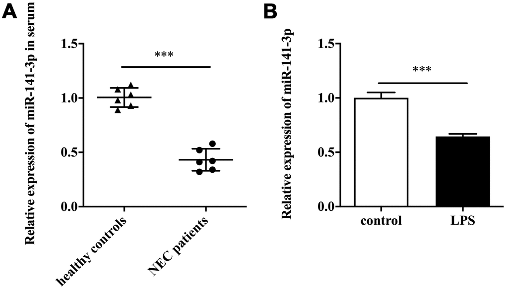 Firstly, we detected miR-141-3p expression in clinical samples. The qRT-PCR result showed that serum samples of patients with NEC existed a lower expression of miR-141-3p compared with healthy controls (Figure 1A). Next, we established the NEC cell model by treating Caco-2 cells with LPS. The in vitro assay showed that LPS induced downregulation of miR-141-3p (Figure 1B).