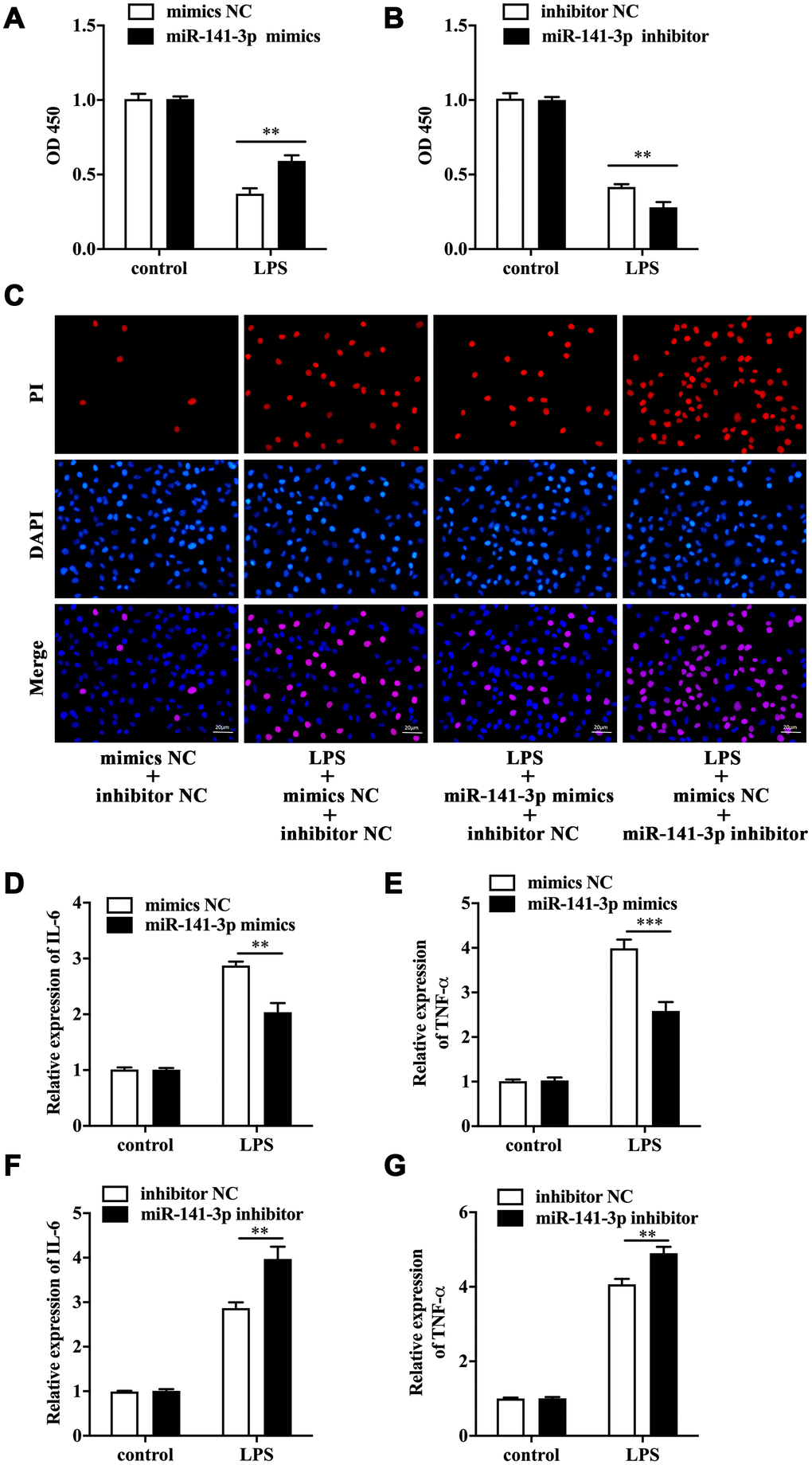 To explore the biological role of miR-141-3p in intestinal epithelial cells of NEC, we conducted cell transfection in Caco-2 cells with miR-141-3p mimics and miR-141-3p inhibitor in the presence or absence of LPS. As was shown in Figure 2A, LPS reduced cell viability of Caco-2 cells by measuring OD 450, which was partially reversed by miR-141-3p mimics. Conversely, miR-141-3p inhibitor could further reduce the decreased cell viability of LPS-treated Caco-2 cells (Figure 2B). The fluorescence analysis showed that LPS increased PI positive rate of Caco-2 cells, which was suppressed by miR-141-3p mimics (Figure 2C). In addition, miR-141-3p inhibitor could further increase LPS-induced PI positive cells (Figure 2C). The qRT-PCR analysis revealed that LPS-induced upregulation of IL-6 and TNF-α was restrained by miR-141-3p mimics (Figure 2D and 2E). However, miR-141-3p inhibitor further facilitated upregulation of IL-6 and TNF-α in LPS-treated Caco-2 cells (Figure 2F and 2G). The above results suggested that miR-141-3p reduced necrosis and inflammation in LPS-treated Caco-2 cells.