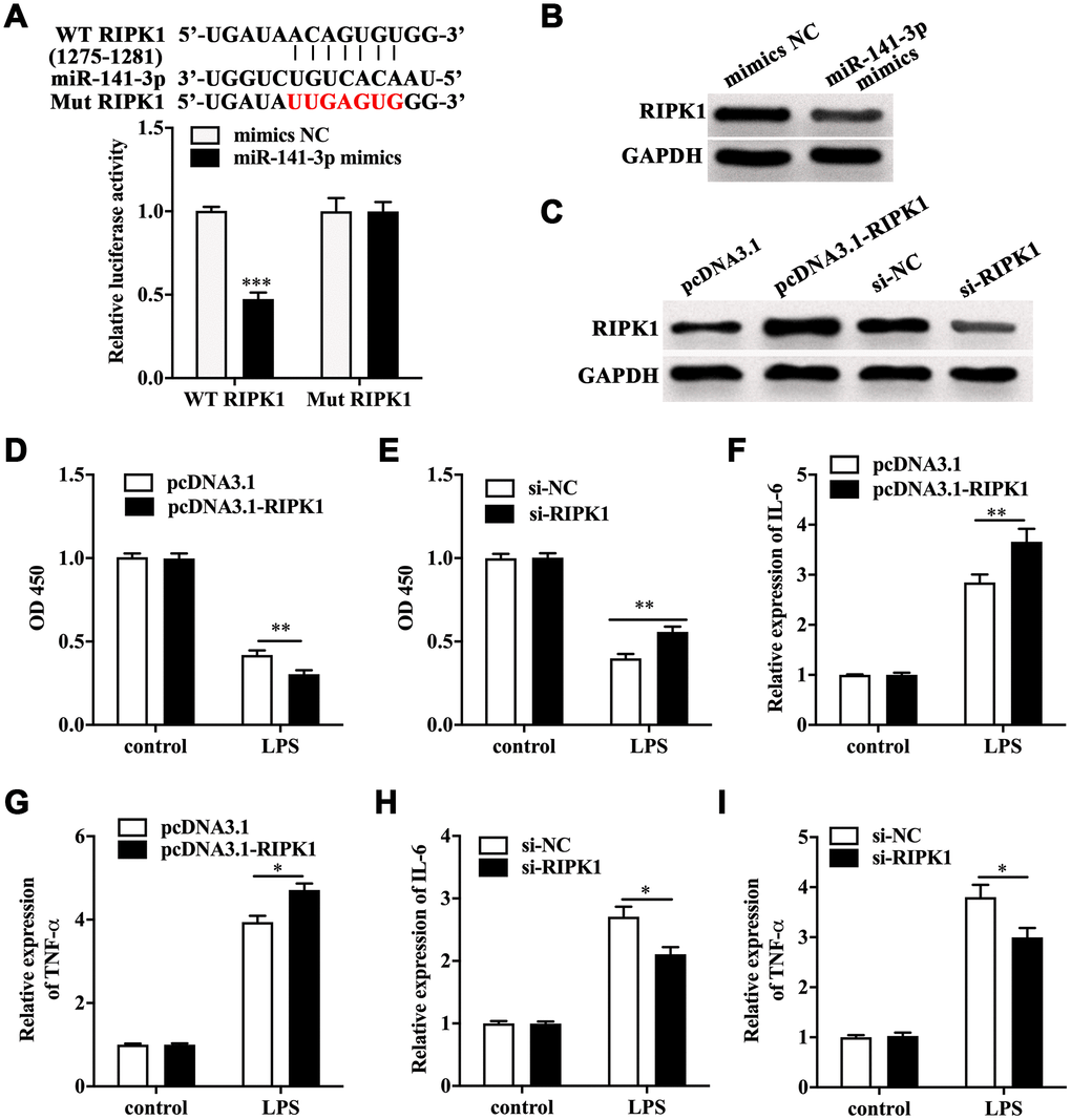 Next, TargetScanHuman 7.2 database was utilized to screen the target of miR-141-3p. We found RIPK1, a key mediator of necroptosis, was one of the potential targets of miR-141-3p. The luciferase reporter gene assay showed a remarkably lower luciferase activity in Caco-2 cells co-transfected with wild type RIPK1 and miR-141-3p mimics (Figure 3A). Notably, miR-141-3p mimics inhibited the expression of RIPK1 in Caco-2 cells (Figure 3B). RIPK1 overexpression and knockdown were performed in Caco-2 cells by transfecting with pcDNA3.1-RIPK1 and RIPK1 siRNA, and the efficacy was measured by Western blot (Figure 3C). CCK-8 assay indicated that RIPK1 overexpression aggravated the decreased cell viability in LPS-treated Caco-2 cells; however, RIPK1 knockdown reversed the decreased cell viability in LPS-treated Caco-2 cells (Figure 3D and 3E). Moreover, we found that RIPK1 overexpression could increase the upregulation of IL-6 and TNF-α (Figure 3F and 3G); while RIPK1 siRNA suppressed the increased expression of IL-6 and TNF-α in LPS-treated Caco-2 cells (Figure 3H and 3I).