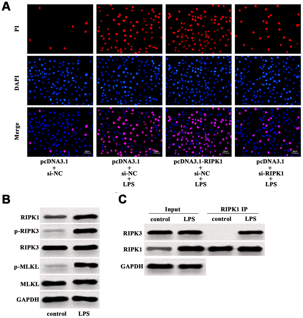 Pierce Co-Immunoprecipitation Kit (Thermo Fisher Scientific, USA) was used to detect interaction of RIPK1 and RIPK3 in accordance with the guidelines. Briefly, the cells with indicated treatment were harvested and lysed by IP Lysis Buffer. The primary antibody RIPK1 (BD Biosciences, USA) was added into the lysis solution containing the total protein, followed by using Sodium cyanoborohydride, Coupling Buffer, Elution Buffer and Loading Buffer, to obtain the experimental samples. RIPK1 was used to the control of IP, and the expression of RIPK1 and RIPK3 was detected by western blot analysis.