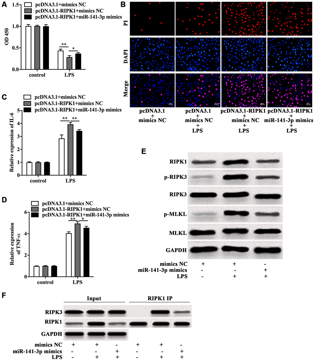 Next, the role of miR-141-3p in RIPK1-mediated Caco-2 cell injury was explored. CCK-8 assay indicated that RIPK1 overexpression magnified the decreased cell viability of LPS-treated Caco-2 cells, which was rescued by miR-141-3p mimics (Figure 5A). In parallel, miR-141-3p mimics reduced PI positive rate of LPS-treated Caco-2 cells in the presence of RIPK1 overexpression (Figure 5B). Additionally, miR-141-3p mimics inhibited LPS-induced elevated expression of IL-6 and TNF-α in pcDNA3.1-RIPK1-transfected Caco-2 cells (Figure 5C and 5D). Western blot analysis revealed that miR-141-3p mimics reversed the upregulation of RIPK1, p-RIPK3 and p-MLKL induced by LPS (Figure 5E). Moreover, miR-141-3p mimics could reduce the interaction of RIPK1 and RIPK3 in LPS-treated Caco-2 cells (Figure 5F), indicating miR-141-3p ameliorated intestinal epithelial cell injury by targeting LPS-induced RIPK1-mediated necroptosis.