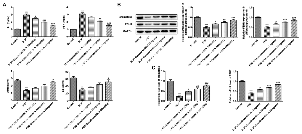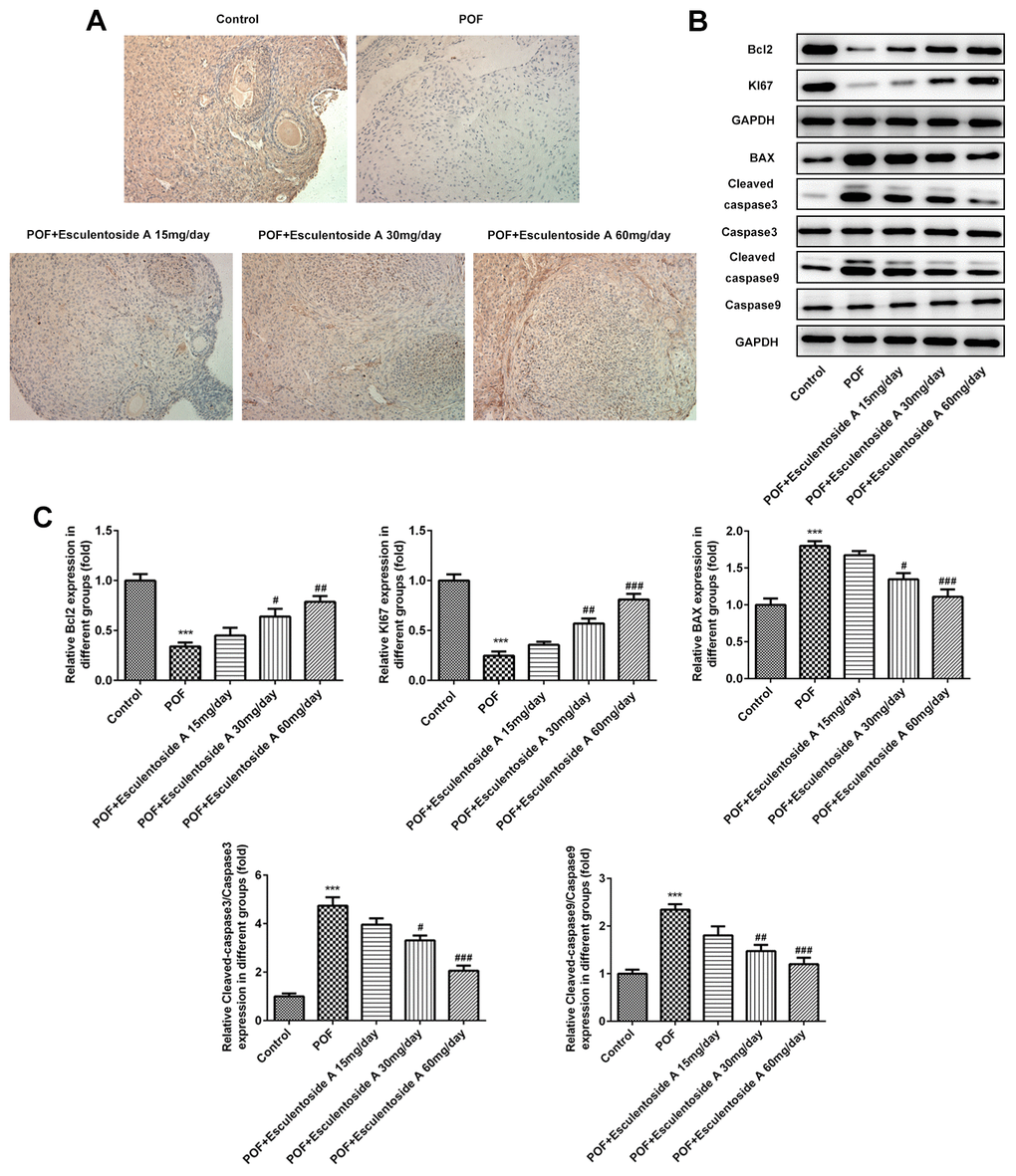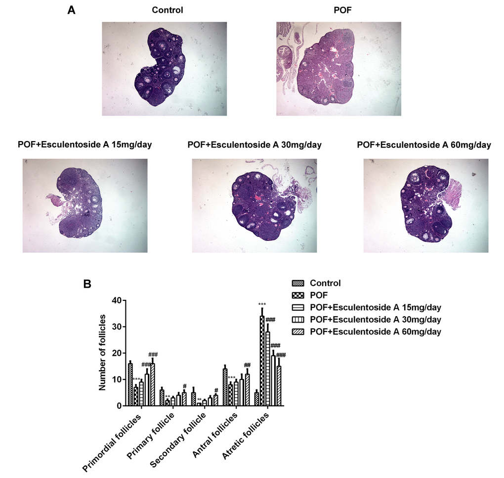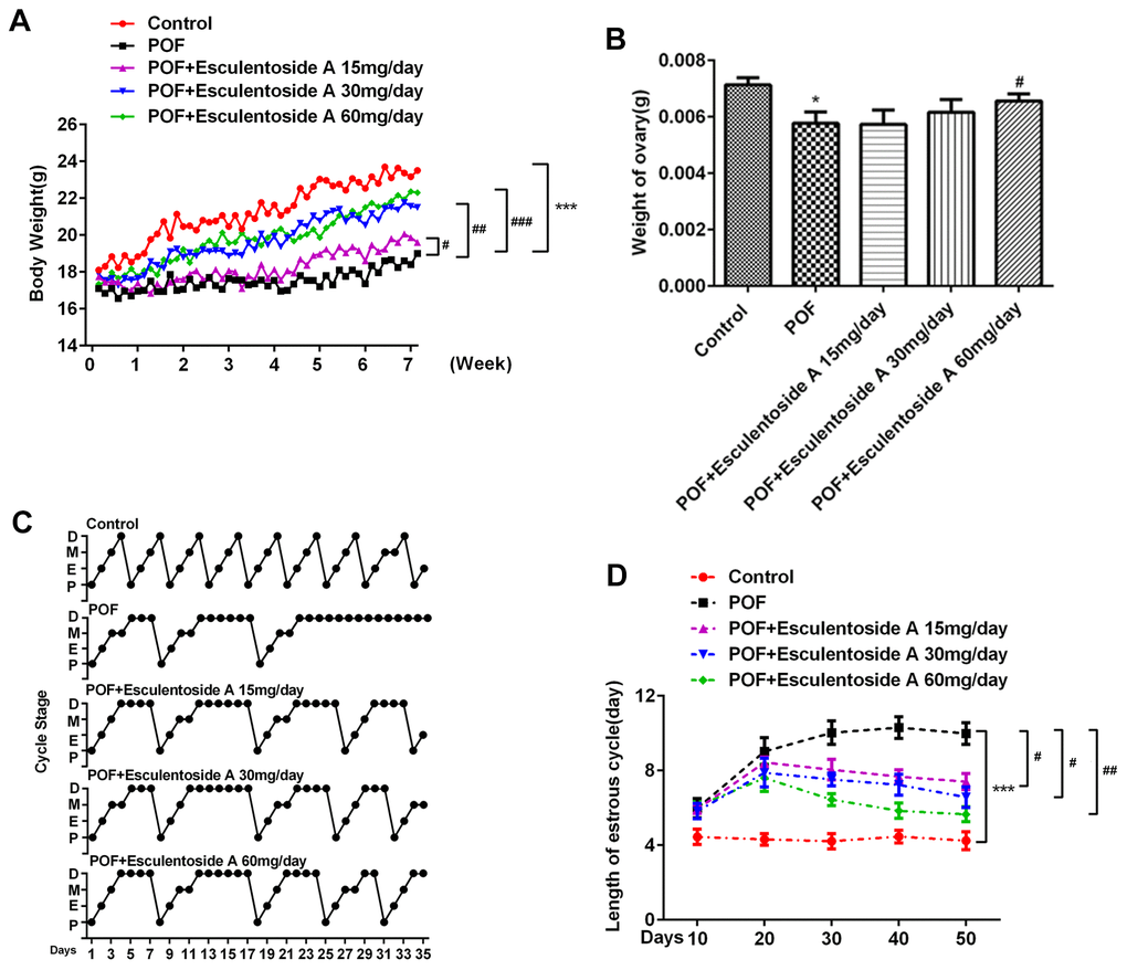 The mice were divided into the Control group (n = 5), the POF group (n = 5) and three POF+Esculentoside A groups (n = 5). The Control group received the same weight-based volume saline only. The POF group and the POF+Esculentoside A group were injected intraperitoneally with 75 mg/kg cyclophosphamide (CY, Aladdin). The POF+Esculentoside A groups were administered intragastrically at the dosage of 15, 30, 60 mg/day for four weeks.