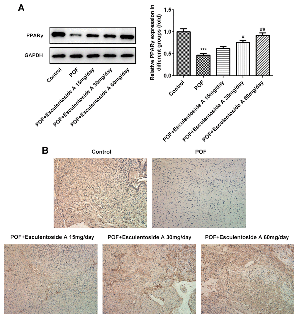 In this study, we for the first time demonstrated that EA administration restored folliculogenesis and GCs in POF mice. Briefly, EA with doses of 15, 30, 60 mg/day were given for 28 days to these mice. The re-establishment of normal body and ovary weights, ovarian histology, estrus cycle and normal hormones levels were observed in aforementioned groups. Consistently, the enriched and reduced expressions of proliferating markers (KI-67 and BCL-2) and pro-apoptotic markers (BAX and CASPASES) in GCs were determined respectively. In addition, EA administration also prompted a potential therapeutic target: PPARγ with expression profile in POF mice equivalent to normal control.
