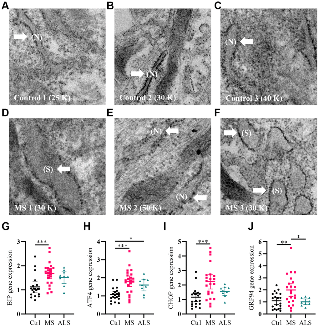 As a first step, we qualitatively analyzed the cellular structure and organization of MS skin fibroblasts using electron microscopy (EM) compared to healthy controls. An increase in endoplasmic reticulum (ER) swelling was more apparent in MS skin fibroblasts when compared to controls (Figure 1A–1F). Whereas the ER in control cell lines remained predominately long and narrow (Figure 1A–1C), we observed a substantial increase in the rounding and swelling of the ER (Figure 1D–1F) in two of the three MS skin fibroblasts. Swelling of the ER is commonly associated with increased cellular stress and the activation of the unfolded protein response (UPR) pathway [26]. Thus, we used quantitative PCR to measure the gene expression level of multiple UPR markers in skin fibroblasts from MS, ALS, and control individuals (Figure 1G–1J). Compared to control skin fibroblasts, MS cells had significant increases in the gene expression level of BIP (heat shock protein family A member 5, HSPA5/BIP, P = 0.0006), ATF4 (activating transcription factor 4, P = 0.0001), CHOP (DNA damage inducible transcript 3, DDIT3/CHOP, P = 0.0008), and GRP94 (heat shock protein 90 beta family member 1, HSP90B1/GRP94, P = 0.0077) (Figure 1G–1J). Likewise, the gene expression level of GRP94 was significantly higher in MS when compared to ALS fibroblasts (P = 0.0256, Figure 1J). In ALS skin fibroblasts, ATF4 gene expression level was significantly higher when compared to controls (P = 0.0461, Figure 1H). These results suggest that MS skin fibroblasts have an underlying stress phenotype that may be distinct from normal controls and ALS.
