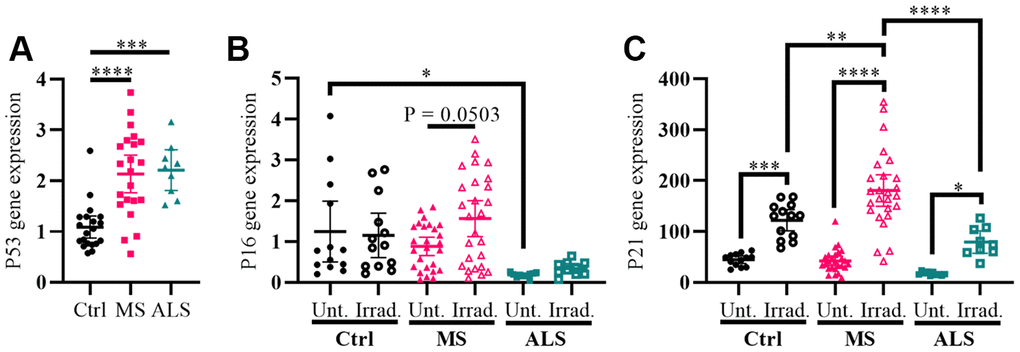 Cellular stress including oxidative stress, DNA damage, epigenetic modifications, oncogene activation, ionizing radiation, and hypoxia can modulate the activity of cell cycle regulators in order to help maintain homeostasis [27–29]. The genes P53 (tumor protein P53), P16 (cyclin dependent kinase inhibitor 2A, CDKN2A/P16), and P21 (cyclin dependent kinase inhibitor 1A, CDKN1A/P21) are key cell cycle regulators and are increasingly recognized for their role in aging, senescence, oxidative stress, inflammation, and neurodegenerative diseases including MS [27–33]. To further evaluate the presence of increased cellular stress in MS skin fibroblasts, we measured the gene expression levels of P53, P16, and P21 using quantitative PCR, which was compared to ALS and control individuals (Figure 2). We detected a significant increase in the P53 gene expression level in both MS and ALS skin fibroblasts (P < 0.0001 and P = 0.0003, respectively) compared to controls (Figure 2A). Compared to control fibroblasts, the endogenous level of P16 in ALS individuals was significantly lower (P = 0.0392, Figure 2B). When exposed to gamma irradiation, a common inducer of senescence and cell stress [34, 35], we detected a near significant increase of P16 in MS skin fibroblasts (P = 0.0503, Figure 2B) while minimal changes were observed in ALS and controls. The endogenous P21 gene expression level between MS, ALS, and control skin fibroblasts was similar (Figure 2C). After gamma irradiation treatment, we detected significant increases of P21 gene expression in all skin fibroblasts when compared to their respective untreated groups (Pctrl = 0.0004, PMS < 0.0001, PALS = 0.0384, Figure 2C). Furthermore, the P21 gene expression level in irradiated MS skin fibroblasts was significantly higher compared to the treated ALS (P < 0.0001) and control (P = 0.003) groups (Figure 2C). These results further reflect an inherent cellular stress phenotype in MS skin fibroblasts, which may be disease specific.