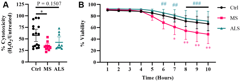 Evidence suggests that mitochondrial dysfunction is a key driver in the pathology of MS [36]. Mitochondrial damage is thought to increase the production of ROS resulting in oxidative stress and injury to the surrounding tissue in MS [36, 37]. Additionally, oxidative damage can result in ER and cellular stress [30, 31, 33, 38]. Given that MS skin fibroblasts show underlying signatures of cellular stress, we sought to determine if they have an altered ability to manage exogenous stress. To do so, we treated MS, ALS, and control skin fibroblasts with hydrogen peroxide and monitored their resiliency using two different cell stress assays (Figure 3). We first tested the cytotoxic response of the skin fibroblasts against an acute treatment with hydrogen peroxide using the MTT assay (Figure 3A). Cells were plated in standard media conditions followed by a two hour treatment with 200 μM hydrogen peroxide. We found that MS skin fibroblasts had a significantly reduced resiliency to hydrogen peroxide treatment when compared to controls (P = 0.0129, Figure 3A). Since the MTT assay reflects metabolic activity of a cell and may not necessarily represent viability [39], we further tested the skin fibroblasts against hydrogen peroxide using the CellTox Green assay. The CellTox Green assay utilizes a membrane-impermeable fluorescent molecule, which produces an increased signal upon binding to DNA. Therefore, the CellTox Green assay more closely detects non-viable cells with compromised membranes [40]. To measure cell viability, skin fibroblasts were treated with hydrogen peroxide and monitored hourly out to ten hours (Figure 3B). Compared to control cells, MS skin fibroblasts displayed greater cytotoxicity by seven hours post-treatment with hydrogen peroxide (P = 0.0132, Figure 3B), which remained significantly different out to ten hours (P = 0.0024, Figure 3B). Furthermore, ALS fibroblasts behaved similarly to controls and did not significantly differ out to ten hours of treatment (Figure 3B). Taken together, these results suggest that both MS and ALS skin fibroblasts have a reduced resiliency to manage exogenous stress compared to control cells (Figure 3A). However, given MS skin fibroblasts have reduced viability compared to ALS and control cells when treated with hydrogen peroxide (Figure 3B), our findings may suggest cell survival mechanisms are altered in MS fibroblasts and may be disease specific.