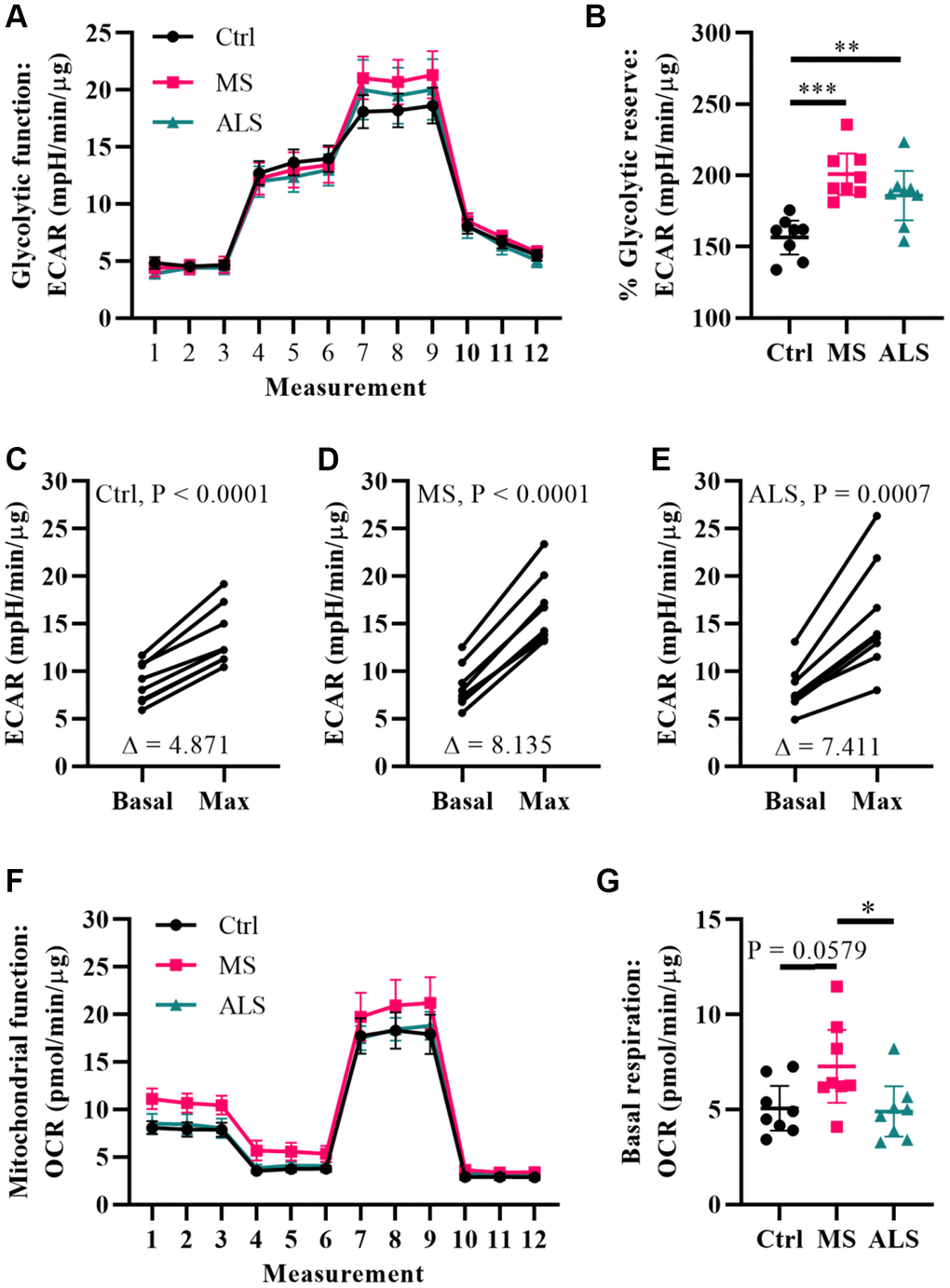 Metabolic processes are highly dynamic and are known to change in response to cellular demands and stress [41]. Several reports have associated mitochondrial dysfunction and metabolic alterations in MS [36, 42, 43]. Thus, we predicted that the stress phenotype detected in MS skin fibroblasts may result in a predisposition to metabolic dysfunction. To gain insight whether the bioenergetics in MS skin fibroblasts were altered, we utilized Seahorse technology to monitor cellular respiration and extracellular acidification (Figure 4). The Seahorse analyzer monitors oxygen consumption rate (OCR) and extracellular acidification rate (ECAR) to provide insight into the metabolic function of live cell cultures [44]. The OCR reflects activity of oxidative phosphorylation where oxygen is consumed during the generation of ATP [44]. Similarly, ECAR is used to monitor glycolytic activity by measuring pH changes presumably due to the production of lactate, an endpoint product of glycolysis [44]. The bioenergetics profiles of skin fibroblasts from MS and ALS individuals were compared to controls and monitored for differences in ECAR (Figure 4A–4E) and OCR (Figure 4F and 4G) using standard Seahorse conditions. Differences in the glycolytic function of MS cells were detected when compared to controls (Figure 4A). In particular, when the skin fibroblasts were treated with oligomycin (an inhibitor of ATP synthase), we detected the greatest percent glycolytic reserve increase in MS skin fibroblasts when compared to ALS and control cells (Figure 4B). As expected, all skin fibroblasts increased their glycolytic flux upon treatment with oligomycin (Figure 4C–4E). However, the average oligomycin-induced increase in glycolytic flux was detected in MS cells (Δ8.14, Figure 4D) compared to ALS (Δ7.41, Figure 4E) and control (Δ4.87, Figure 4C) skin fibroblasts. This suggests that both MS and ALS skin fibroblasts undergo greater metabolic alterations when mitochondrial function is perturbed, which may rely on increased glycolytic functions when compared to control cells. Using the Seahorse Mitochondrial Stress Test, we further analyzed mitochondrial function in MS, ALS, and control skin fibroblasts (Figure 4F). In MS skin fibroblasts, we detected a near significant increase in basal oxygen consumption (P = 0.0579) when compared to controls (Figure 4G). A significant increase in MS basal oxygen consumption (P = 0.0393) was detected when compared to ALS skin fibroblasts (Figure 4G). These results are indicative of altered mitochondrial function in MS skin fibroblasts when compared to ALS and control cells. Taken together, these results demonstrate that the bioenergetics in MS and ALS skin fibroblasts are altered compared to control cells but may be disease specific.