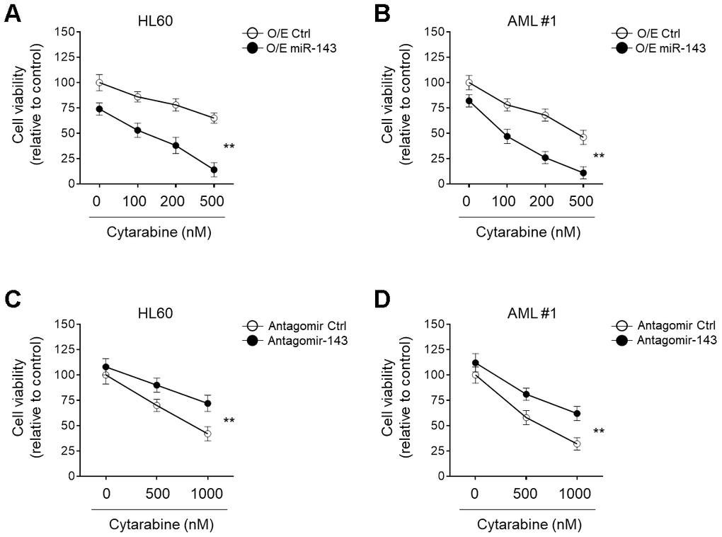 miRNA signatures are associated with chemosensitivity in tumors, including AML [26–28]. The downregulation of miR-143 in cytarabine-treated AML cells led us to evaluate its possible role in cytarabine cytotoxicity. To explore this, miR-143 was ectopically overexpressed in HL60 cells and then cells were treated with cytarabine. Cells viabilities were determined using MTT assays. The result showed that in comparison to control samples, miR-143 overexpression resulted in further decreased cell viability upon cytarabine treatment (Figure 2A), indicating an enhanced cytarabine cytotoxicity in HL60 cells upon miR-143 overexpression. Additionally, similar results were also obtained when primary AML cells were investigated (Figure 2B). On the other hand, when miR-143 was knocked down by transfection of an antagomir, the survival rate of cytarabine-treated HL60 cells (Figure 2C) and primary AML cells (Figure 2D) was profoundly improved. In addition to MTT assays, similar results were obtained using CCK-8 experiment (Supplementary Figure 1A, 1B). And all the above phenomena were also reproducible in a time-dependent manner (data not shown). Taken together, these lines of evidence suggest that miR-143 functions to increase cytarabine cytotoxicity in AML cells, at least in vitro.