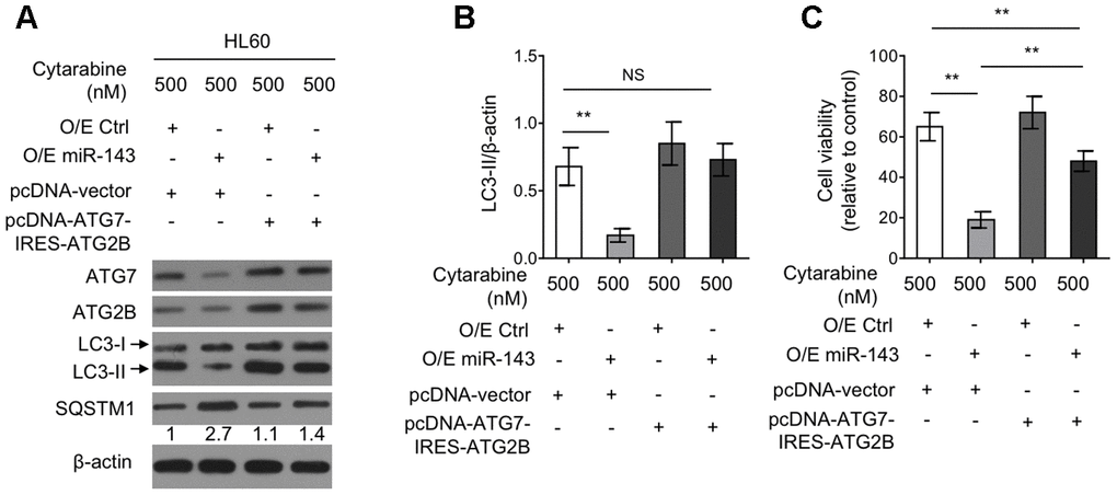 To elucidate the functional role of reduced expression of ATG7 and ATG2B in miR-143-suppressed autophagy as well as in miR-143-promoted cytarabine cytotoxicity, a tandem vector capable of simultaneously co-expressing ATG7 and ATG2B (pcDNA-ATG7-IRES-ATG2B) was transfected into cytarabine-treated HL-60 cells overexpressed with miR-143. The results from western blotting analysis demonstrated that along with the recovered expression of ATG7 and ATG2B by transfection of pcDNA-ATG7-IRES-ATG2B construct, the inhibited autophagy by miR-143 overexpression was restored to the level in overexpression control group, as evidenced by LC3-II turnover (Figure 5A, 5B), describing that miR-143 inhibits autophagy through decreasing the expression of ATG7 and ATG2B under this condition. Also, autophagy restoration drastically increased cell viability in miR-143-overexpressing HL-60 cells treated with cytarabine, although did not completely reach to that of overexpression control group (Figure 5C). Nonetheless, these evidence together suggest that miR-143-mediated autophagy inhibition via suppressing expression of ATG7 and ATG2B plays a critical role in enhancing cytarabine cytotoxicity in AML cells.