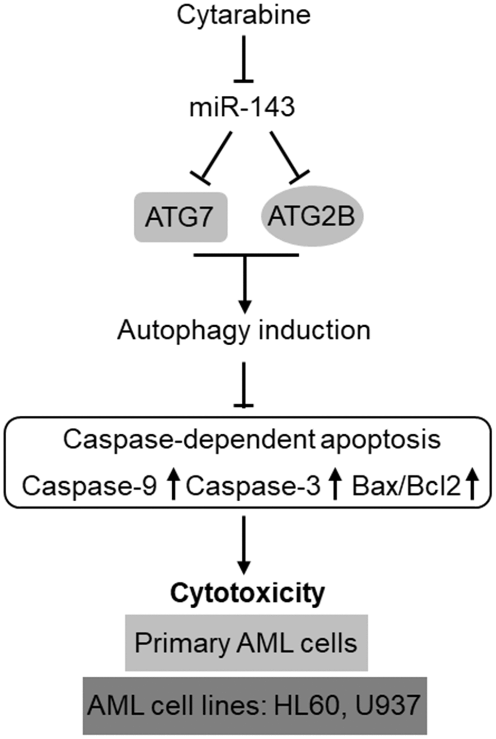 In summary, this study provides molecular basis demonstrating that miR-143 sensitizes AML cells to cytarabine treatment by suppressing anti-apoptotic autophagy through directly targeting ATG7 and ATG2B. Evidence obtaining from animal models is preferably needed to demonstrate whether miR-143 enhances cytarabine cytotoxicity in vivo.