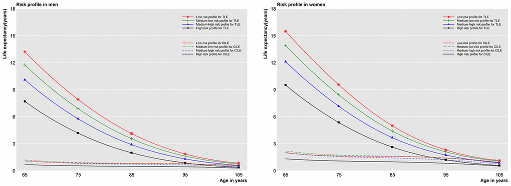 Due to known sex differences in life expectancy, analyses were performed separately for men and women. Models were first fitted separately for each modifiable factor and then for these factors aggregated into four risk profiles. All models were adjusted for demographic characteristics, socioeconomic factors, functional limitation, chronic diseases, and modifiable factors, if applicable.