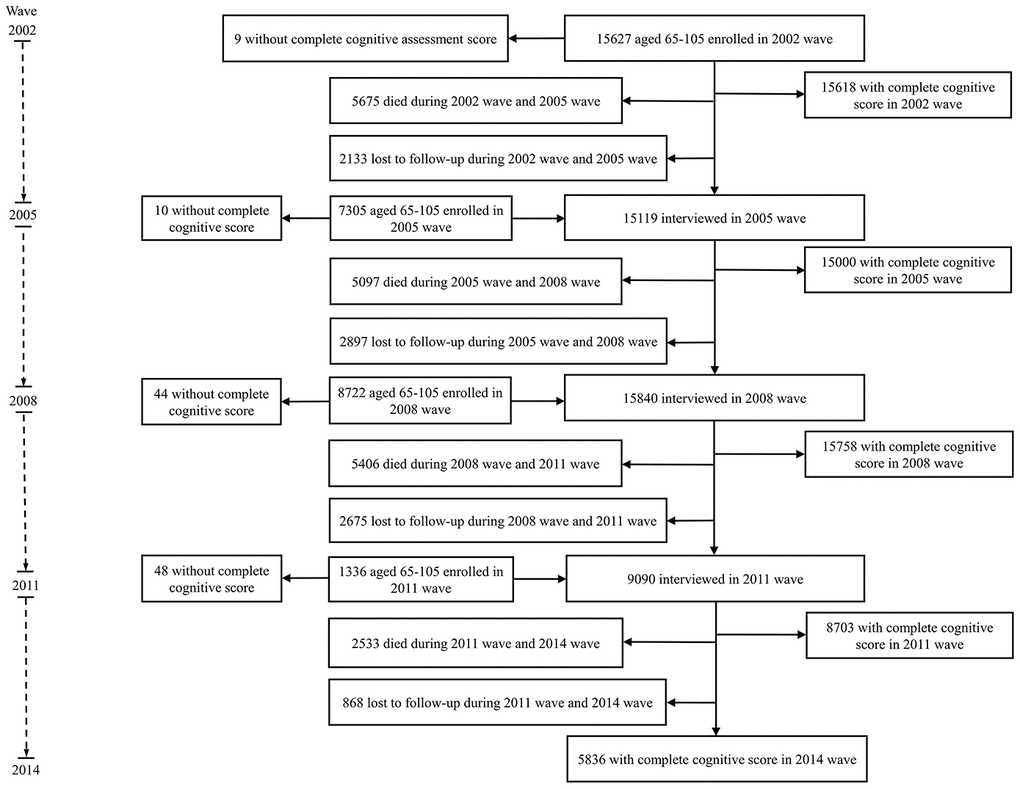 Data was sourced from a cohort of elderly people who participated in the Chinese Longitudinal Healthy Longevity Survey (CLHLS), a nationwide population-based survey conducted in 22 provinces of China. The first wave was carried out in 1998, and six follow-ups with participant replacement accounting for attrition were conducted in 2000, 2002, 2005, 2008, 2011 and 2014. The first and second waves were limited to persons aged 80 and over. Those aged 65 to 79 were added in 2002 and subsequent waves. The CLHLS attempted to interview all centenarians within sampled areas and adopted a targeted random-sample design to ensure representativeness with approximately equal numbers of male and female nonagenarians, octogenarians, and young-old (aged 65-79 years) living near the centenarians. The study design details and data quality have been described elsewhere [23]. The CLHLS was approved by the ethics committee of Peking University, and written informed consent was obtained from every participant or proxy (next of kin or guardian).