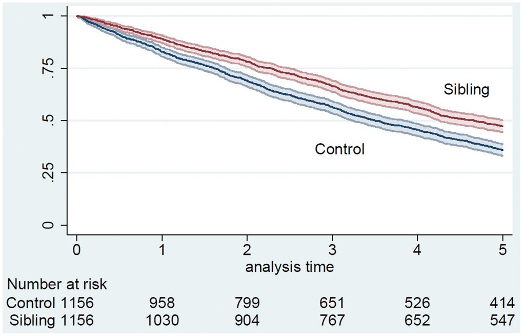 Survival time from January 1st, 2006 was described with Kaplan-Meier curves for female siblings and controls separately and compared using the logrank test. Survival analyses were performed using stratified Cox proportional hazards models based on the matching data with and without potential confounding covariates. Proportional-hazards assumption was tested using Schoenfeld residuals.