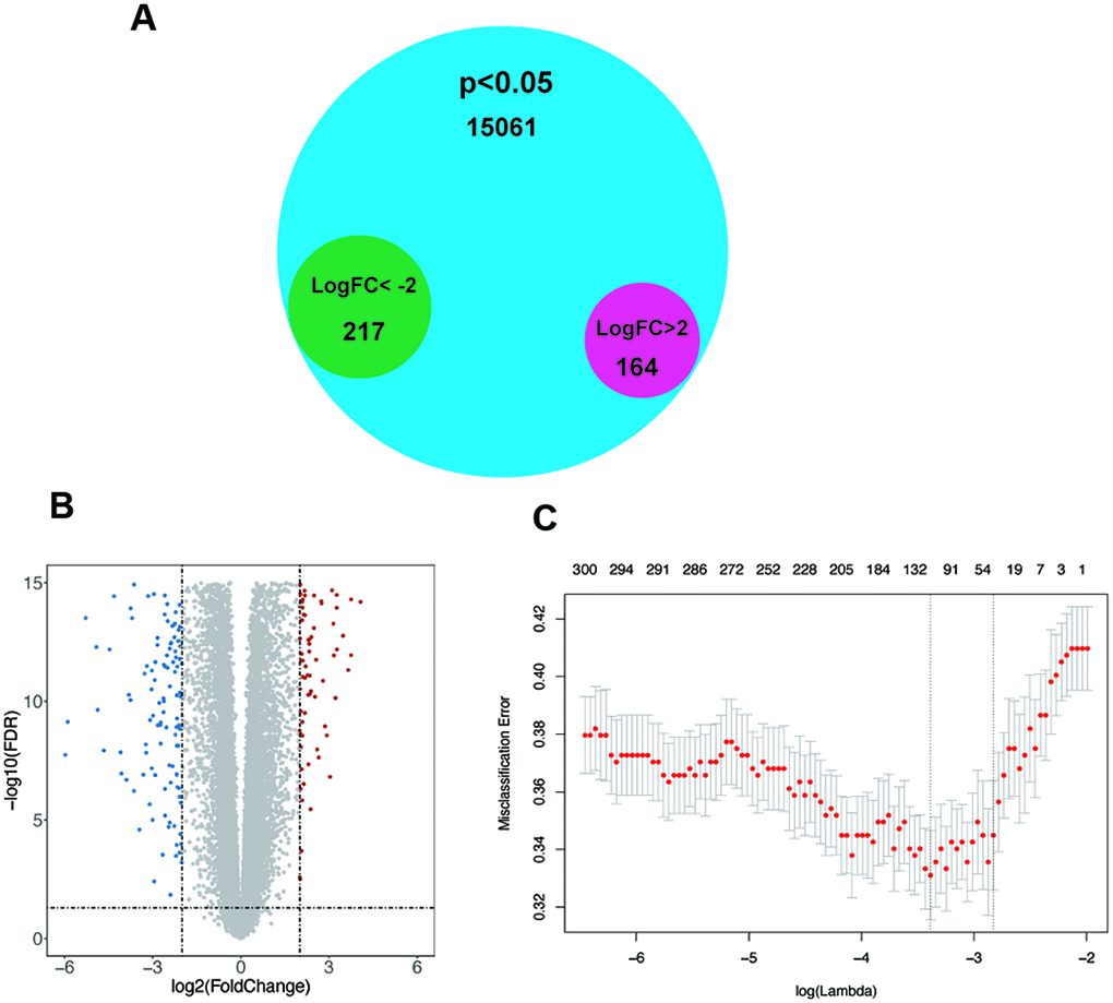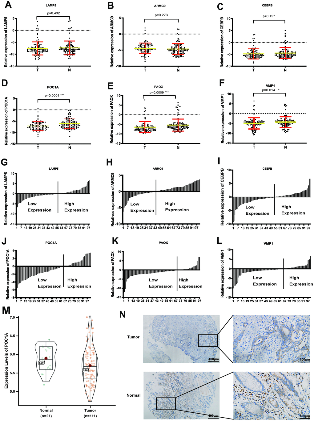 To determine significantly altered genes, a GEO dataset (GSE54129) was selected (Supplementary Figure 1A, 1B), and the Limma [20] R package was used for differential expression analysis (|logFC|>2, p<0.05). Thereby, we discovered 164 upregulated genes and 217 downregulated genes (Figure 1A, 1B). After using LASSO regression analysis, we established a statistical model by cross validation. As misclassification error was regarded as the minimized target parameter, we acquired 6 significantly differentially expressed genes, Lysosomal Associated Membrane Protein Family Member 5 (LAMP5), CCAAT Enhancer Binding Protein Beta (CEBPB), Armadillo Repeat Containing 9 (ARMC9), Polyamine Oxidase (PAOX), Vacuole Membrane Protein 1 (VMP1), POC1 centriolar protein A (POC1A) for further research (Figure 1C). In these 6 genes, only POC1A and PAOX were demonstrated to have down-regulated expression and other 4 genes were up-regulated.
