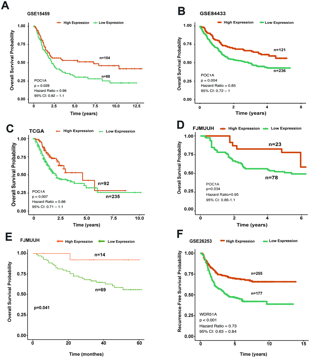 Furthermore, the same method was adopted for analyzing recurrence-free survival (RFS). We applied another GEO dataset (GSE26253) for further investigation and found that degradation of POC1A was significantly related to poor RFS in GC (Figure 4F). Thus, all survival analyses indicated that POC1A acts as a tumor suppressor in GC.
