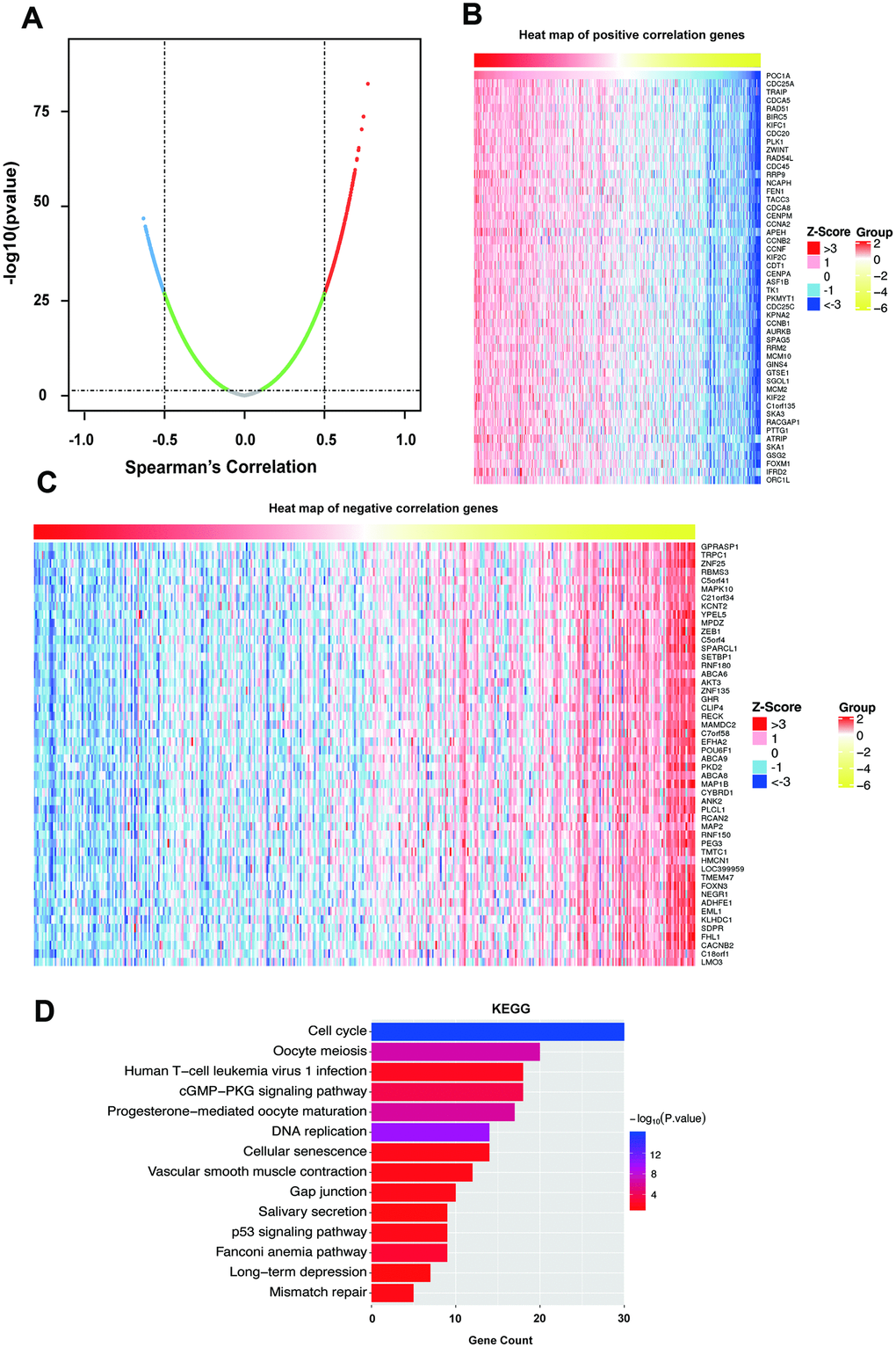 LinkedOmics (http://www.linkedomics.org/login.php) [46] is a cancer-associated database for analyzing TCGA. We used it to discover genes in TCGA STAD that were correlated with POC1A according to Spearman correlation and selected LinkFinder in LinkedOmics to establish a heatmap plot for the coexpressed genes. After acquiring strongly correlated coexpressed genes, we performed GO and KEGG analyses of these genes with the clusterProfiler R package [45].