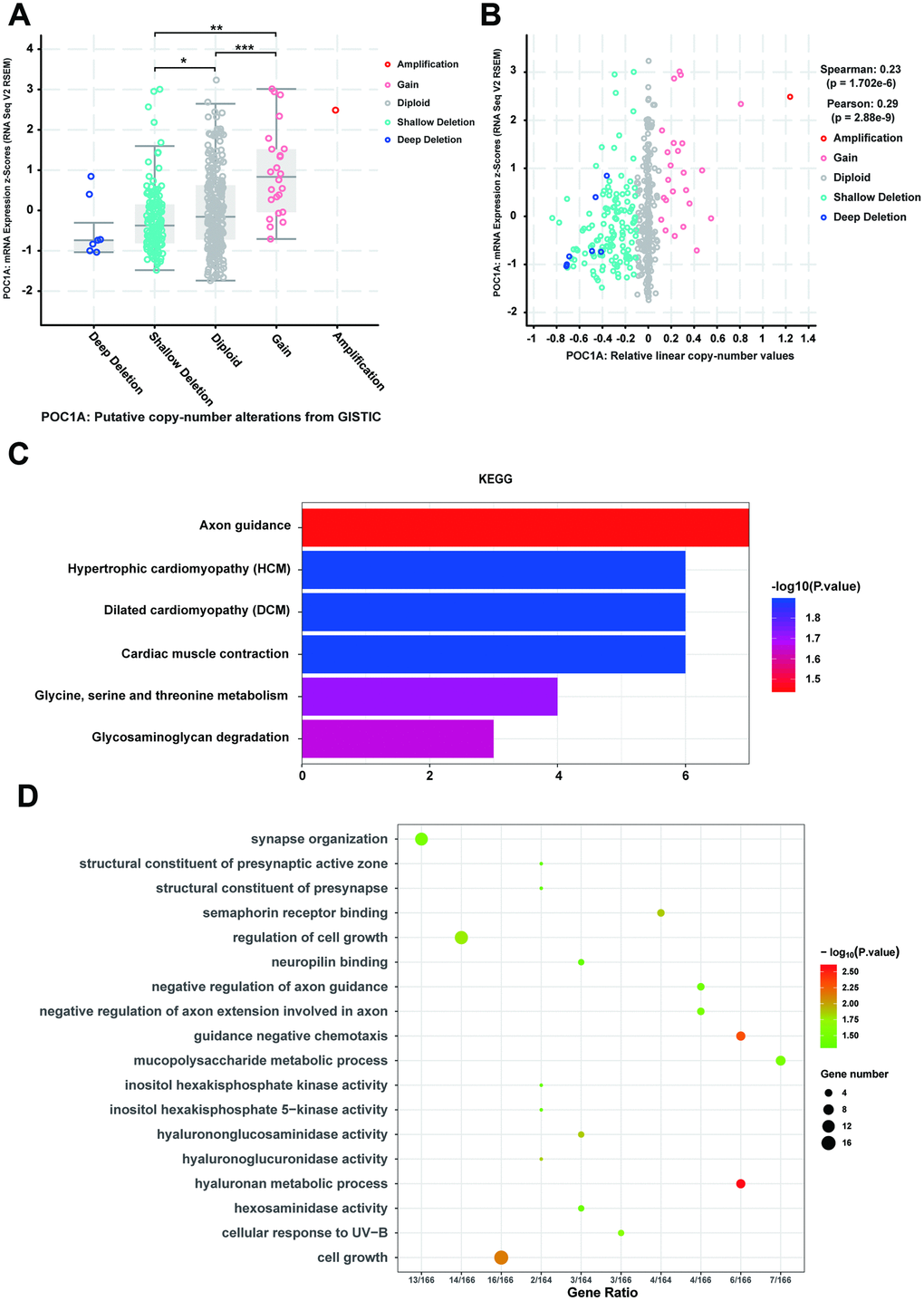 Considering that genomic alterations of POC1A are pathogenetic, copy number alteration (CNA) of POC1A attracted our attention. With the cBioPortal database, we discovered that POC1A deletion was significantly correlated with its decreased mRNA expression in STAD (Figure 6A, 6B). Thus, we further examined genes with changes occurring with POC1A deletion in STAD, revealing 212 genes (Supplementary Table 7). Then, we performed KEGG pathway analysis of these genes and found that glycine, serine and threonine metabolism and some other pathways were enriched (Figure 6C, Supplementary Table 8). In addition, analysis of GO enrichment demonstrated that these genes primarily induce cell growth and regulate of cell growth (Figure 6D, Supplementary Table 9), which corresponded to the result that POC1A expression was correlated with tumor size (Supplementary Tables 2, 3).