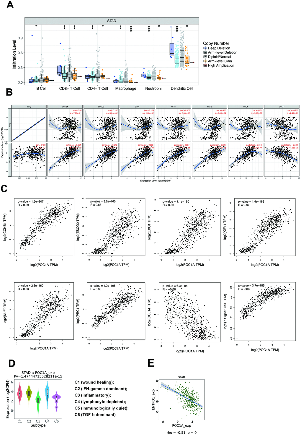 However, our study has limitations. The reliability of the analyses of molecular mechanism and immune infiltration levels, especially the correlation between immune signatures and POC1A, is not supported by experiments in vivo and in vitro. More experiments for verifying the functions of these small molecules can benefit the in-depth understanding of POC1A in GC and encourage progress in diagnosis and therapy. Therefore, the molecular mechanism of immune infiltration still needs further study.